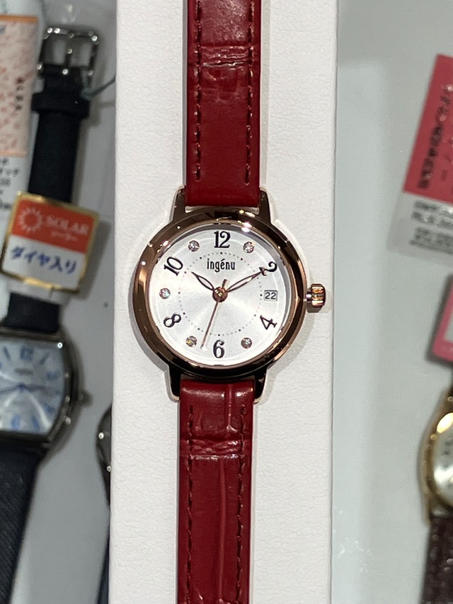 セイコー アンジェーヌ AHJK446 SEIKO ALBA アルバ アンジェーヌ ingenu AHJK446 ingénu から「キラキラと華やかなモデル」が登場。針に白塗装をかけ、より一層視認性をアップしています。 ingénu (アンジェーヌ)は、フェミニンな自分らしさを大切にする女性に向け、セイコーウオッチが展開するブランドです。 時計としての使いやすさを基本に、特別な日や何気ない毎日に、シーンを選ばず着けられるレディスウオッチです。 ★スタッフのおすすめポイント★ ステンレスケースに5気圧防水(日常生活用強化防水)でこのお洒落感。それなのに一万円でおつりがくるなんて、まさにコスパ最強です♪ 駆動方式:電池式クオーツ キャリバーNo:VJ22 ケース材質:ステンレス(ピンクゴールド色めっき) 裏ぶた:ステンレス バンド特徴:皮革(カーフ) ガラス材質:カーブ無機ガラス 精度:平均月差±20秒 防水:日常生活用強化防水(5気圧) 電池寿命:約3年 重さ:18g 厚み:7.5mm ケース外径:24.0mm クリスタルガラス入りダイヤル ※上記はセイコー公式の記載です