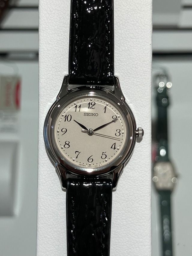 セイコーセレクション STTC005 STTC005 セイコーセレクション レディス 電池式クオーツ SEIKOの考える時計の基本機能とデザイン性を追求。機能・品質・デザインのトータルバランスを重視する人へむけたセレクションです。 ★スタッフのおすすめポイント★ 時代がどう変わろうとも流されない、不変のものというのが世の中にはありますが、この時計もそういう価値観を持ったものの一つでしょう。文字盤の少し焼けたようなアンティークホワイトの色味も渋くて◎。まさにシンプルイズベストを体現した、飾らないドレスウォッチです。ペアになるメンズモデル:SBTB005もあります➞https://jikodo.base.shop/items/123306552 Specifications ムーブメント キャリバーNo 7N01 駆動方式 電池式クオーツ 精度 平均月差±15秒 電池寿命 約3年 機能 秒針停止機能 ケース・バンド ケース材質 ステンレス ケースサイズ 厚さ:5.7mm 横:23.9mm 縦:30.4mm ガラス材質 ハードレックス バンド材質 牛皮革 時計仕様 防水 日常生活用防水 重さ 16.0g ※上記はセイコー公式の記載です