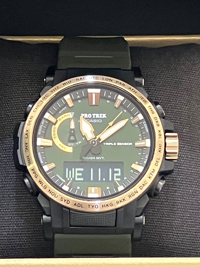 ★限定★カシオ プロトレック PRW-61ANS-3JR CASIO PRO TREK 30th Anniversary Model PRW-61ANS-3JR PRO TREK 30周年記念モデル Climber Line PRW-61ANS-3JR 本格アウトドアギアPRO TREKの30周年を記念した特別モデルです。 ブランドコンセプト“One with Nature”を象徴する森の木漏れ日をテーマに、自然を表現するグリーンと光を表す30周年記念ゴールドを基調としたデザイン。ゴールドIPを施したメタル遊環、バンドに刻まれた歴代モデル名、ケースバックの30周年ロゴなど特別感あふれるディテールが魅力です。 機能面では方位・気圧・高度・温度を正確に計測。タフソーラーで安心して長時間使用でき、マルチバンド6で常に正確な時刻を表示します。 また、10気圧防水で様々な自然環境に対応します。 ケースやバンドには環境負荷低減に貢献するバイオマスプラスチックを採用。自然を愛するアウトドア愛好家の活動をサポートしながら、地球環境にも配慮した時計です。 ★スタッフのおすすめポイント★ アウトドアウォッチの決定版・プロトレックの30周年記念特別限定モデル! ただでさえ完成度の高いデザインなのに、限定の特別仕様で更に格好良くなってます♪ 当然ながら登山や山歩きなどの装備品として頼れる機能満載なので、プロトレックファンの方のみならず、あらゆるアウトドア愛好家にとって実用的価値のある逸品。どうせ手に入れるなら歴史的な記念モデルを! おすすめですよ!! 仕様 ケースサイズ(縦×横×厚さ) 51 × 47.4 × 14.7 mm 質量 57 g ケース・ベゼル材質 樹脂(バイオマス)/ステンレススチール バンド ソフトウレタンバンド(バイオマス樹脂) 防水性 10気圧防水 耐環境性能 耐低温仕様(-10℃) 時刻修正 電波時計 日本・北米・ヨーロッパ・中国地域対応 MULTIBAND6 使用電源・電池寿命 タフソーラー(ソーラー充電システム) センサー機能 方位計測機能:16方位・方位の角度(0~359°)を計測、方位連続計測(60秒)、北方位指針機能、磁気偏角補正機能、方位補正機能(2点補正) 高度計測機能/相対高度計(計測範囲:-700~10,000m、1m単位)、高度差インジケーター(計測範囲1:100m/5m単位、計測範囲2:1000m/50m単位)、高度傾向グラフ、計測間隔設定機能(5秒/2分毎)※最初の3分間のみ1秒毎、高度メモリー(計測年月日・時刻・高度を最大30本マニュアルメモリー)、自動記録データ(最高/最低高度、オート積算(上昇/下降)メモリー) 気圧計測機能(計測範囲:260~1,100hPa、1hPa単位)、気圧傾向グラフ(過去20時間分を表示)、気圧差インジケーター(計測範囲:±10hPa/1hPa単位)、気圧傾向インフォメーションアラーム(特徴的な気圧の変化が起こった場合に矢印と報音でお知らせします) 温度計測機能(計測範囲:-10~60℃、0.1℃単位) 外装 ガラス 無機ガラス リューズ ねじロック式リューズ 表面加工 ゴールドIP(ベゼル部) バンド装着可能サイズ 145~215mm その他 ネオブライト 時計機能 ワールドタイム ワールドタイム:世界29都市(29タイムゾーン、サマータイム設定機能付き)+UTC(協定世界時)の時刻表示、UTCダイレクト呼出機能、ホームタイムの都市入替機能 ストップウオッチ ストップウオッチ(1/100秒、24時間計) タイマー タイマー(セット単位:1分、最大セット:60分、1秒単位で計測) アラーム 時刻アラーム5本・時報 ライト ダブルLEDライト: 文字板用LEDライト(フルオートライト、スーパーイルミネーター、残照機能、残照時間切替(1.5秒/3秒)付き)、 LCD部用LEDバックライト(フルオートライト、スーパーイルミネーター、残照機能、残照時間切替(1.5秒/3秒)付き) ライトカラー LED:ホワイト カレンダー フルオートカレンダー 操作音ON/OFF切替機能 操作音ON/OFF切替機能 針位置補正機能 針位置自動補正機能 パワーセービング機能 パワーセービング機能(暗所では一定時間が経過すると表示を消し運針を停止して節電します) バッテリー表示/警告 バッテリーインジケーター表示 駆動時間 フル充電時からソーラー発電無しの状態での駆動時間 機能使用の場合:約6ヵ月 パワーセービング状態の場合:約25ヵ月 精度 ※電波受信が行われない場合は、通常のクオーツ精度(平均月差±15秒)で動作します。 その他 12/24時間制表示切替 針退避機能(手動、自動(高度、気圧、温度計測時)) 時刻修正詳細 ホームタイム都市(受信機能対応都市)/受信電波 東京/日本の標準電波JJY40・JJY60 (ホノルル)、(アンカレジ)、ロサンゼルス、デンバー、シカゴ、ニューヨーク/アメリカの標準電波WWVB ロンドン、パリ、アテネ/イギリスの標準電波MSF・ドイツの標準電波DCF77 香港/中国の標準電波BPC ※( )内の各都市は条件が良ければ受信する場合もあります。 電波受信機能:自動受信(最大6回/日)(中国電波は最大5回/日)/手動受信、 <日本>受信電波:JJY、周波数:40kHz /60kHz(福島/九州両局対応モデル) <北米地域>受信電波:WWVB、周波数:60kHz <ヨーロッパ地域>受信電波:MSF/DCF77、周波数:60kHz /77.5kHz <中国>受信電波:BPC、周波数:68.5kHz *ホームタイム設定を受信可能な都市に設定すると、都市に合わせた局を受信します。尚、時差は選択した都市によって設定されます。 センサー
