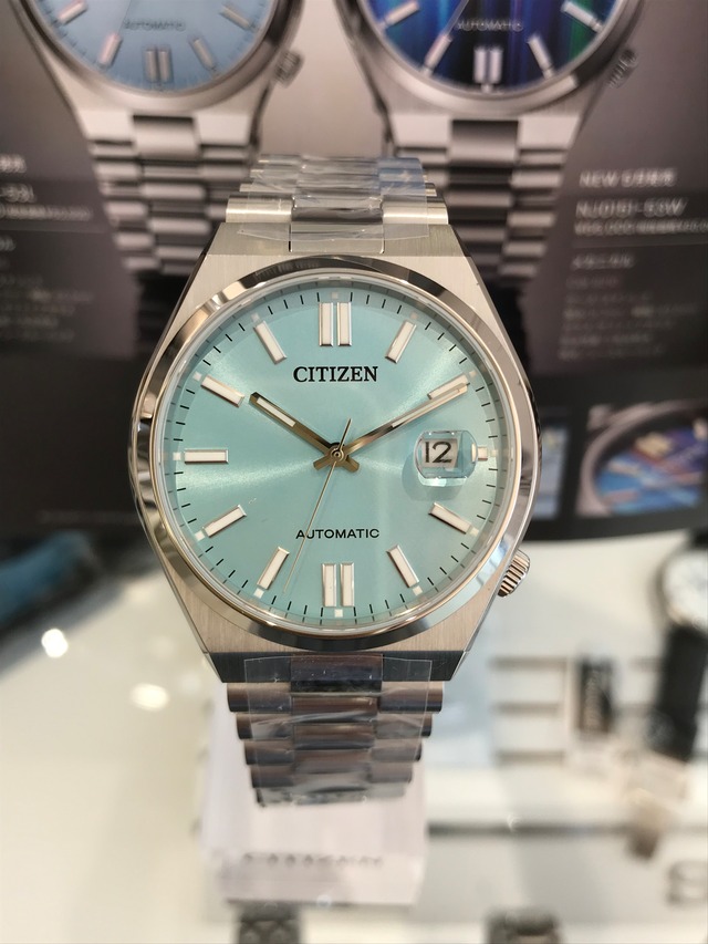 シチズンコレクション NJ0151-88M CITIZEN COLLECTION “TSUYOSA”Collection 豊富なカラーバリエーションで人気のシリーズ 海外では“TSUYOSA”Collectionの愛称で親しまれ、人気を博しているモデル。発色の良い文字板にシンプルでベーシックな針とインデックスを組み合わせ、すっきりとしたデザインが魅力の機械式時計です。スポーティなケース形状と腕なじみの良い3列バンドで付け心地の良さにもこだわり、カレンダー部分には視認性を高める拡大鏡レンズを採用しました。シースルーバックの裏ぶたで、機械式時計ならではの回転する錘(おもり)やメカの動きを楽しめます。 ★スタッフのおすすめポイント★ 先に海外でブレイクしたシリーズですが、「こういうのを待ってた!」という方も多いのではないでしょうか。機械式ならではの時計らしい時計で、その本格的な質感を存分に味わえるデザインは、まさに王道と言えるでしょう。中でもこの(俗に言う)ティファニーブルーは何とも言えない良い色ですね。時間を見るたび晴れやかな気分になります♪ 程よく華がある格好いい時計です。おすすめですよ! 製品スペック 商品番号 NJ0151-88M キャリバーNo. 8210 動力 機械式(自動巻き+手巻き) 精度 −20~+40秒/日 持続時間 約40時間(最大巻上時) 重量 138g 厚み 11.7mm ケースサイズ 横 40.0mm ケース素材 ステンレス バンド素材・タイプ ステンレス 三ツ折れプッシュタイプ バンド幅 9.0mm バンド調整可能サイズ 145~208mm ガラス サファイアガラス 防水性能 5気圧防水 デザイン特徴 夜光(針+インデックス) シースルーバック 機能 秒針停止機能 振動数:21,600回/時 石数:21石 日付表示 日付早修正機能 メーカー保証 1年間メーカー保証 (MY CITIZENご登録により2年間) ※重量、厚み、サイズは参考値としてご参照ください。 ※価格及び仕様は、予告なく変更する場合があります。 ※精度は静的状態にて測定したものです。機械式時計の特性上、使用される条件(携帯時間、時計の姿勢、腕の動き、ゼンマイの巻上具合など)によっては、日差範囲を超える場合があります。持続時間は、目安です。 ※上記はシチズン公式の記載です。