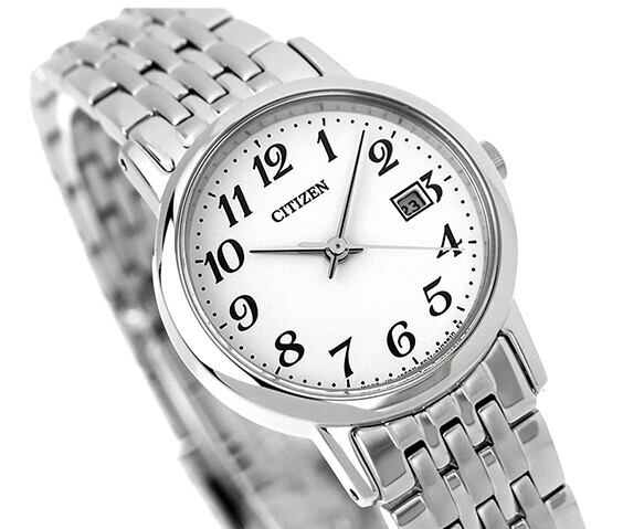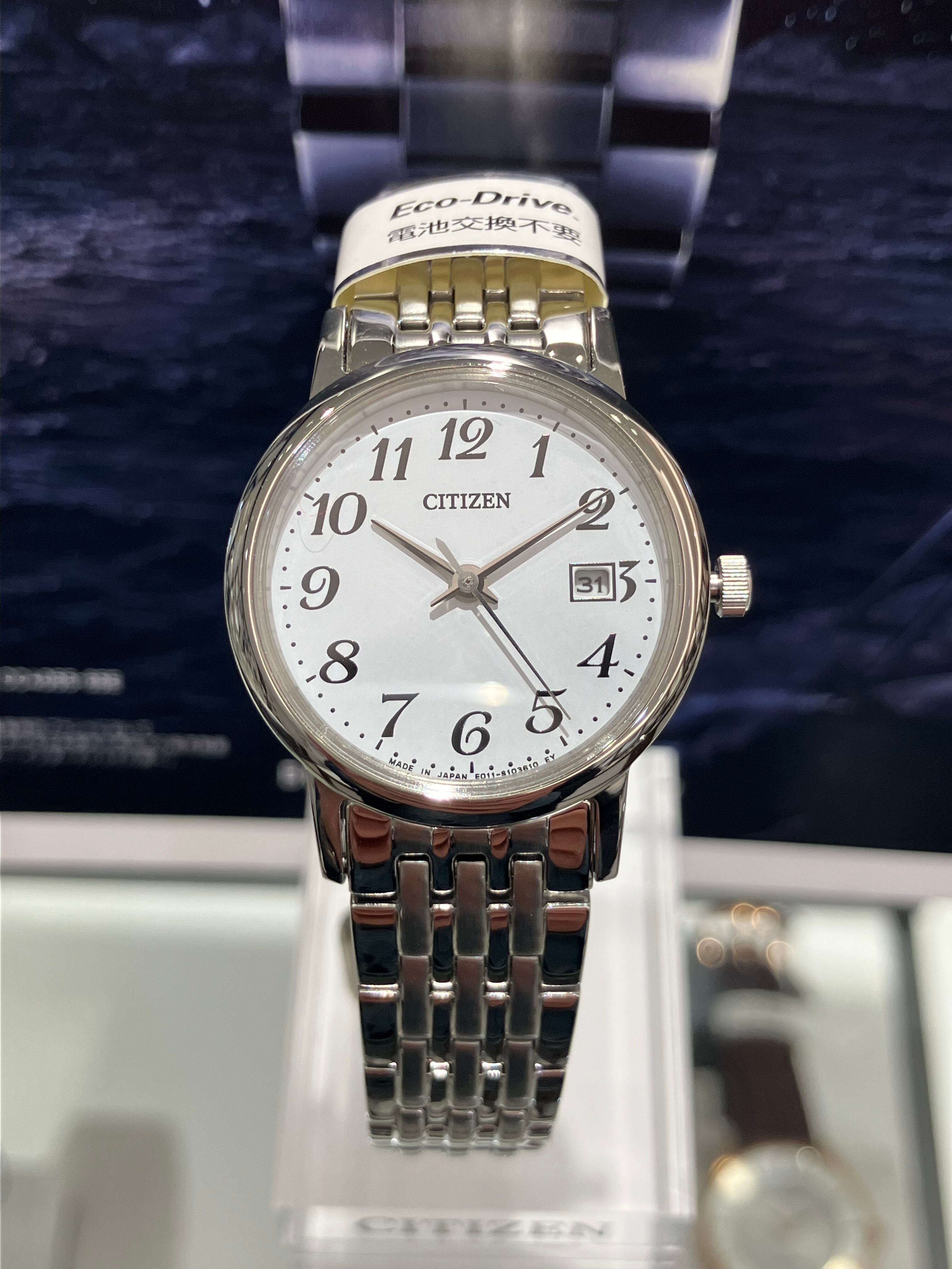 ロングセラーのシンプルなカレンダー付モデル。大きすぎず小さくなく、オール数字なのでとにかく見やすく、適度なボリューム感と細かいコマのブレスレットがベーシックながら華やかさを演出してくれます。メンズモデルもありますので、ペアウォッチとしてプレゼントにも最適ですよ♪