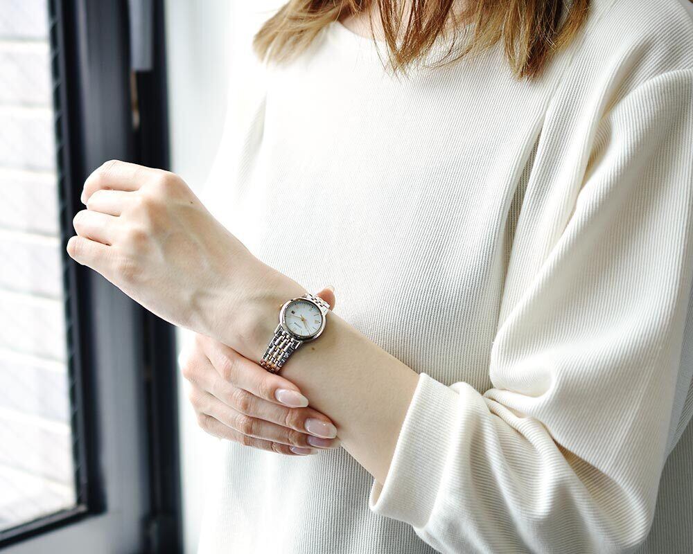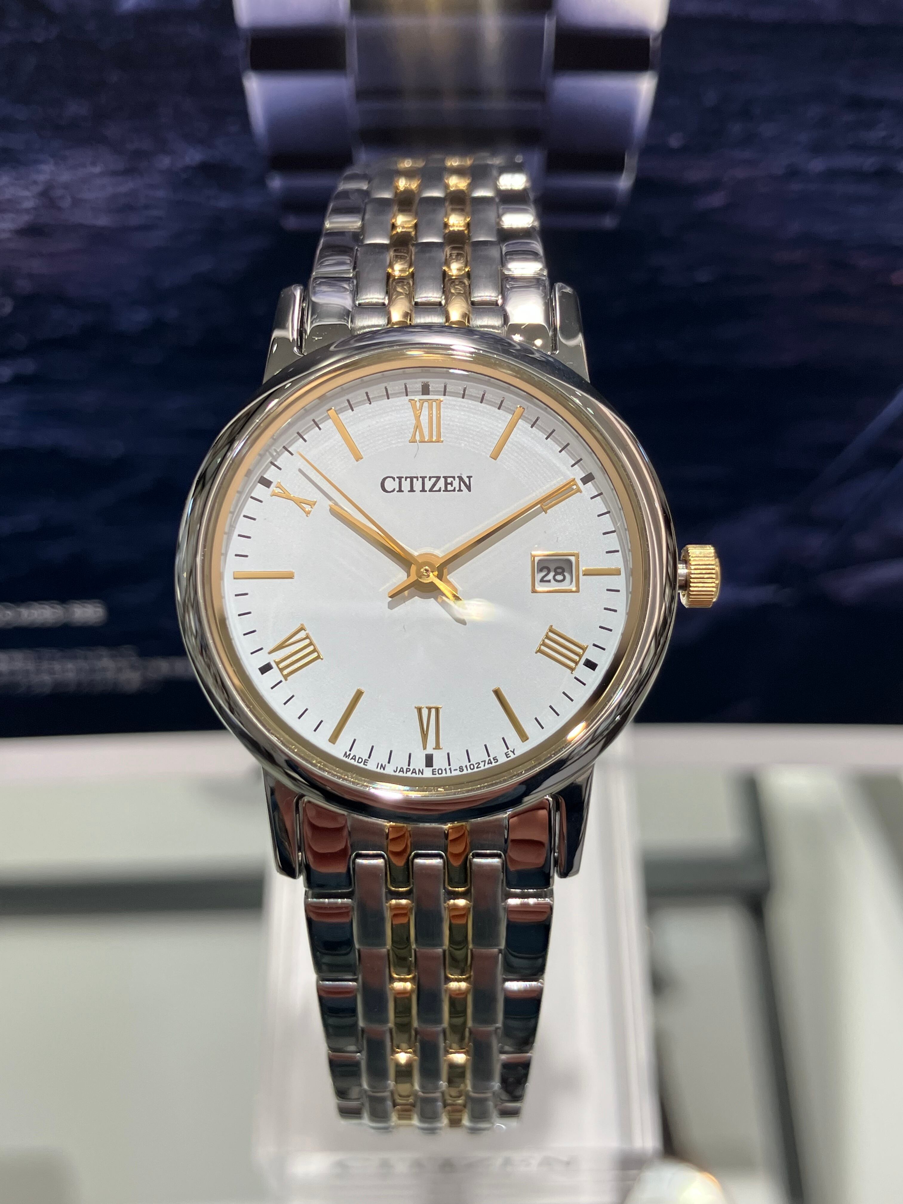 ロングセラーのシンプルなカレンダー付モデル。適度なボリューム感と細かいコマのブレスレットが、ベーシックながら華やかさを演出してくれます。メンズモデルもありますので、ペアウォッチとしてプレゼントにも最適ですよ♪