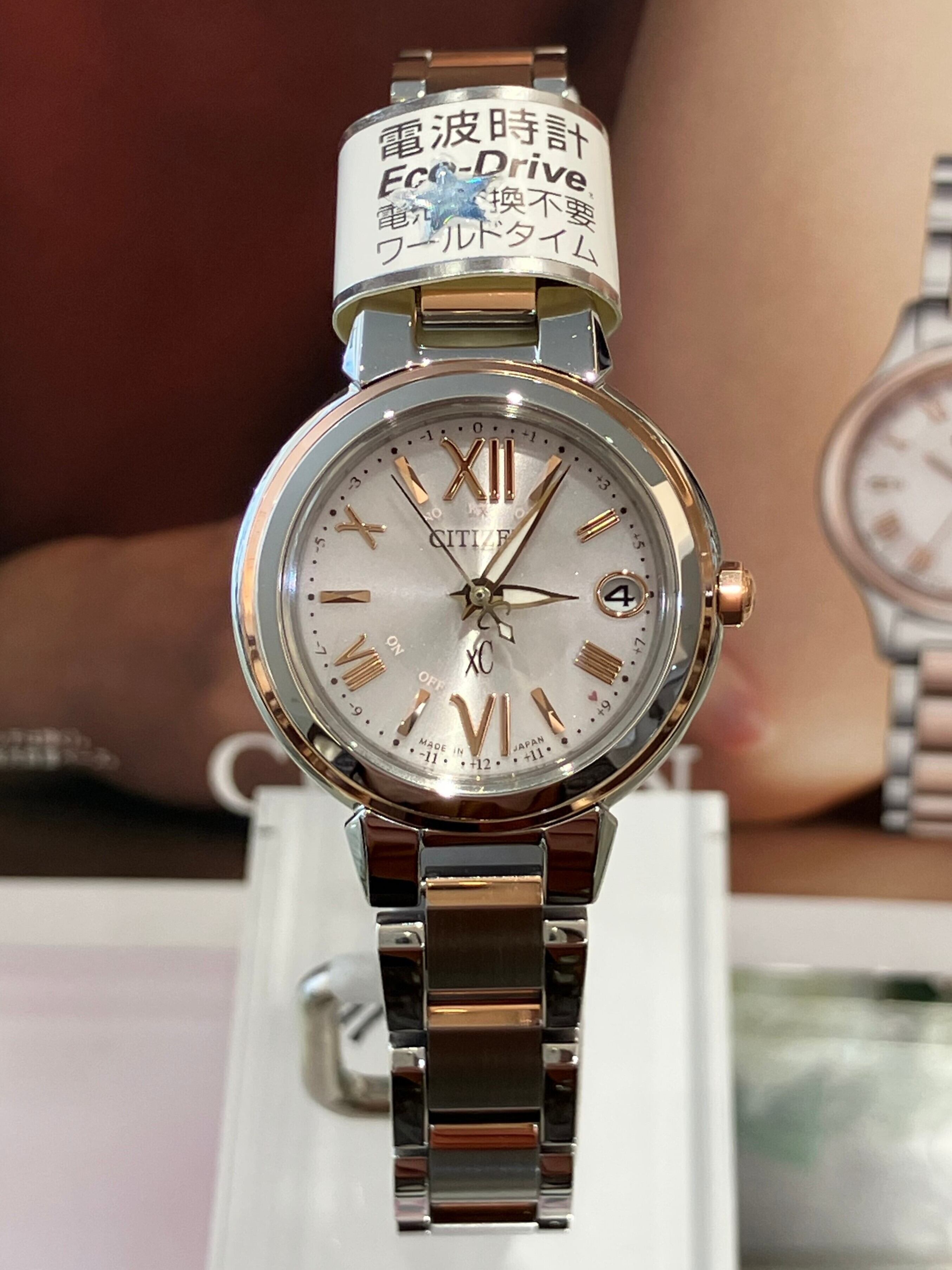 シチズン xC のロングセラーモデルです。流行に左右されないサイズ感で着けやすく、何にでも合わせやすいデザインが人気。ベゼルとブレスレットのピンクゴールドに合わせた、ほんわりピンクの文字盤がかわいいですよ♪