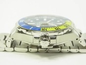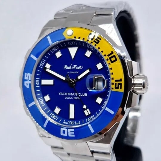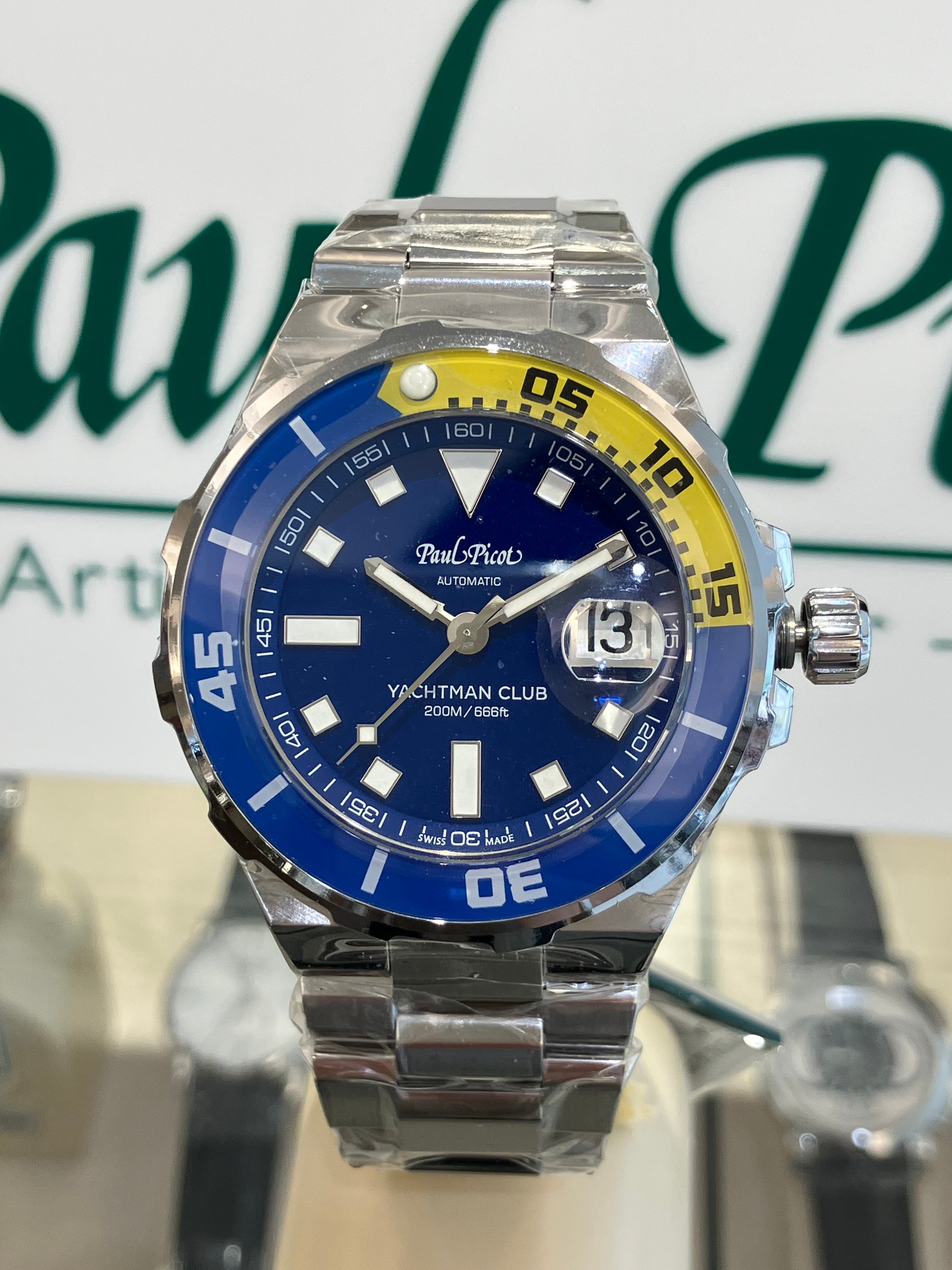 今やポール ピコの顔とも言える、ヨットマンクラブのブルーⅹイエローモデル。最近ではすっかりウクライナカラーという認識が強い色合わせですが、非常に美しいカラーリングで目を惹くデザインです。それでいて、ダイバーズ系のツートンベゼルとしては意外に珍しい色合いなので、ちょっと人と違った時計をお探しの方にもお奨め致します。この透明感のある美しさの秘密は、ベゼルにサファイヤクリスタルを採用しているからこそ。セラミックとはまた違った趣で、独特の格好よさがありますね。普段はなかなかご紹介できないモデルですので、この機会に是非店頭でお試しくださいませ。