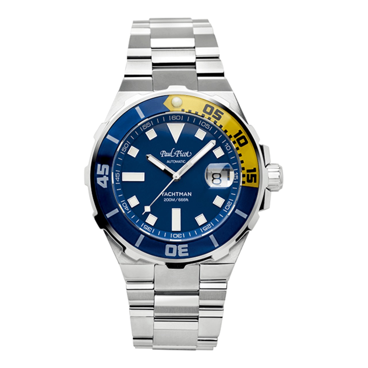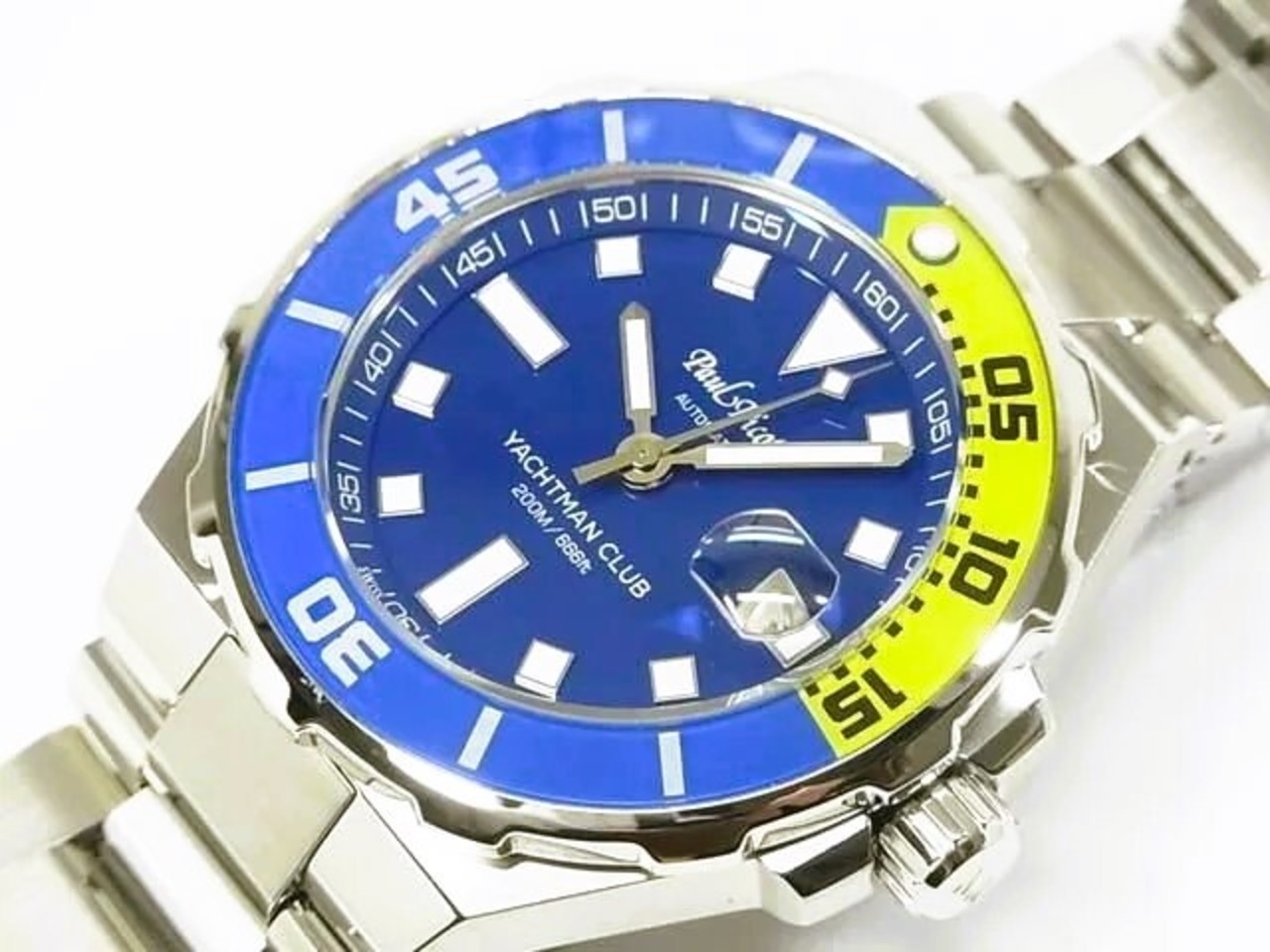 1987年に誕生した「プロンジャー」は、綿密な設計と高い機能性でポール ピコを象徴するコレクションとなりスポーツユーザーに愛されてきました。その「プロンジャー」のデザインをよりシンプルに、よりスポーティに進化させたのが「ヨットマンクラブ」です。2色が織りなす印象的なベゼル、着用感を追求したステンレススチールのブレスレットが腕元を快適に包み込みます。200mの防水性機能、逆回転防止ベゼルに加え、視認性にも優れたスポーツウォッチです。