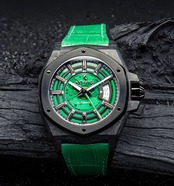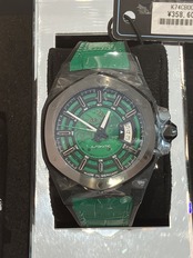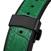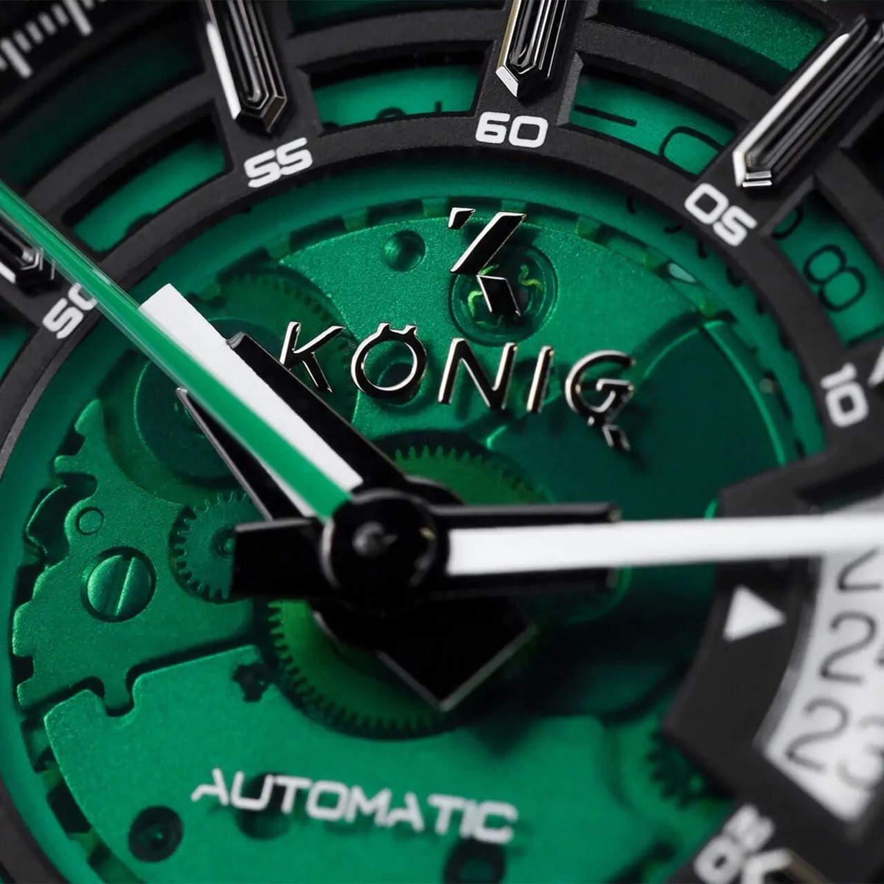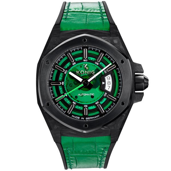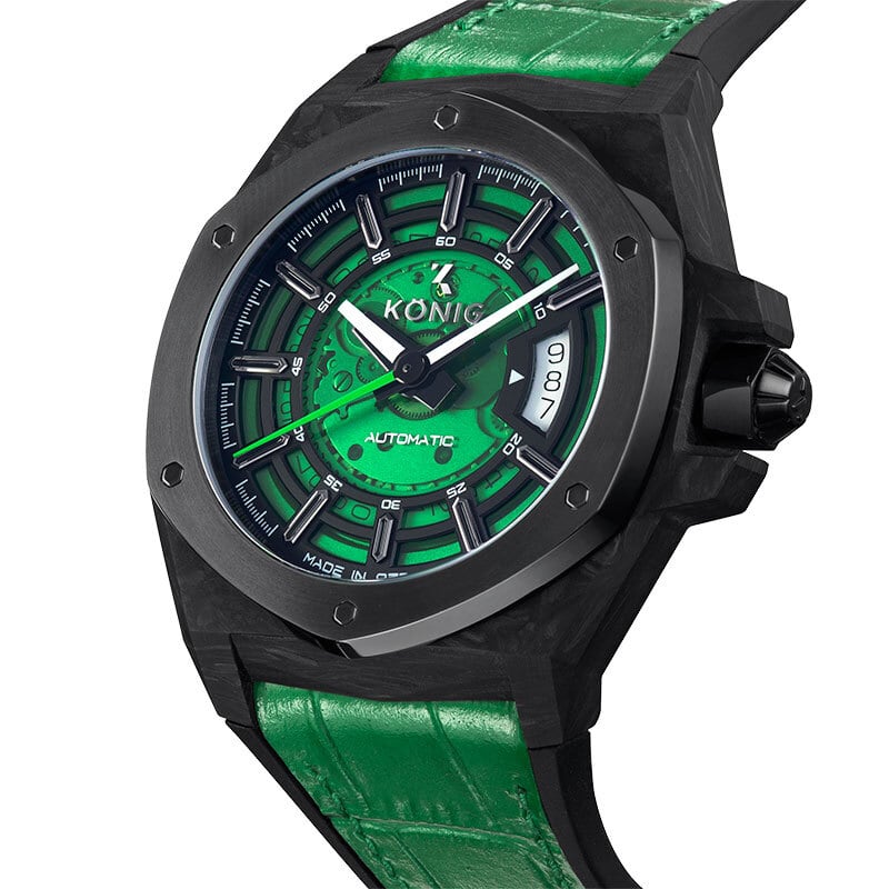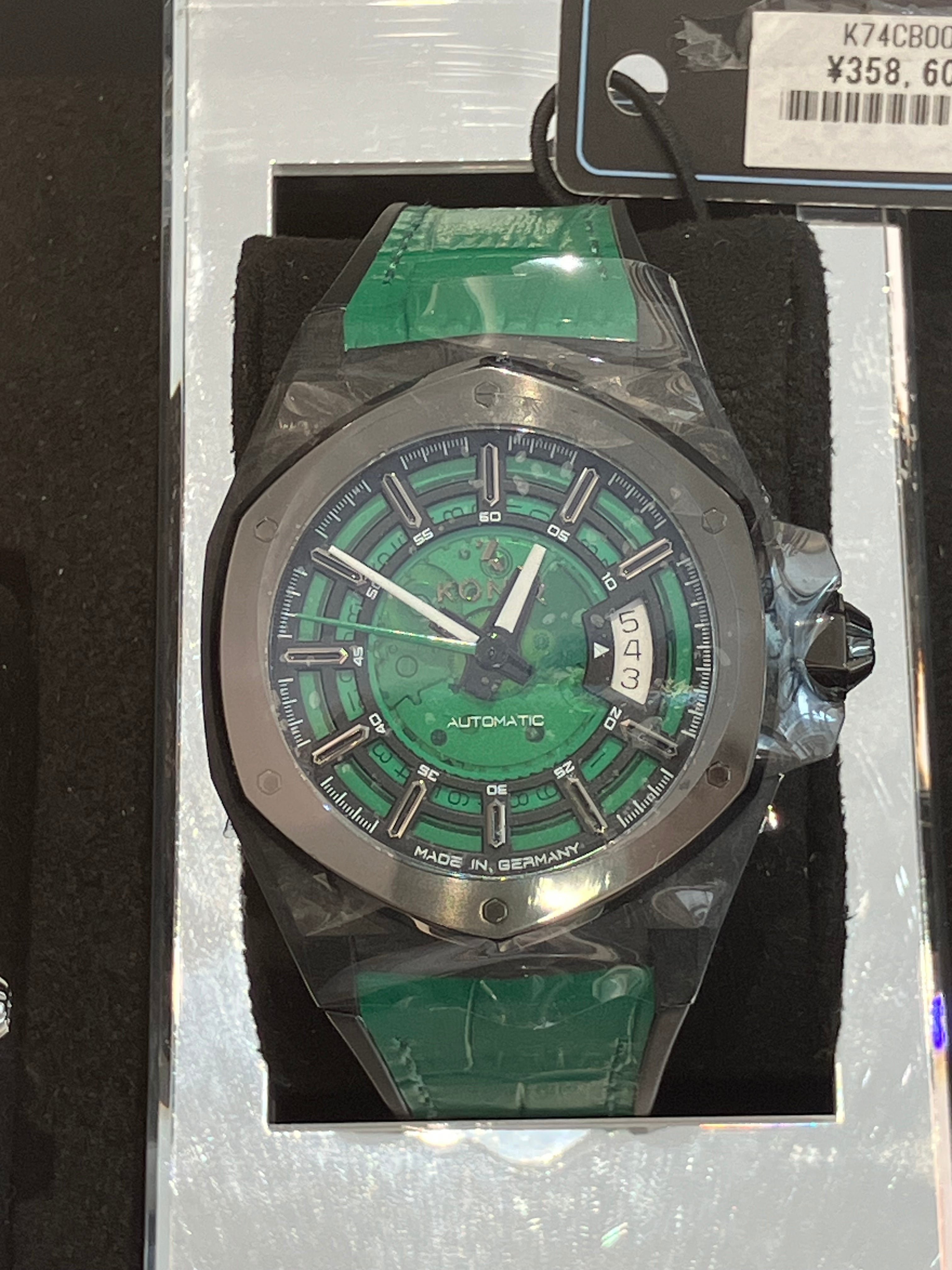2020年創業、新進気鋭の時計ブランド Konig74(ケーニグ74)のK74 CARBONです。ケース素材はカーボン、特徴的な六角形ベゼルは傷の付きにくいセラミック、そしてストラップはレザー&ラバーという、異素材ミックスのハイブリッド。当店のイチ押しはこのグリーンカラーモデルです。ドイツ人創業者リコ・プロスの熱き想いと心を揺さぶる唯一無二の個性を、是非この機会にお試しください!