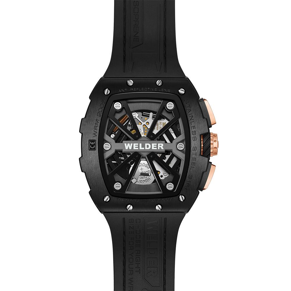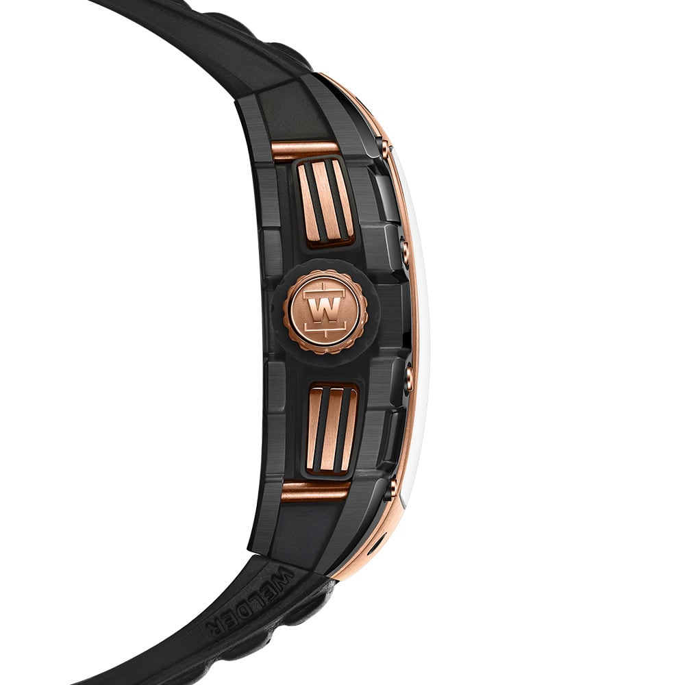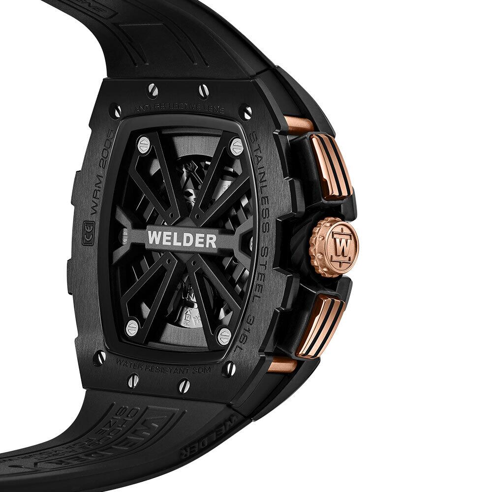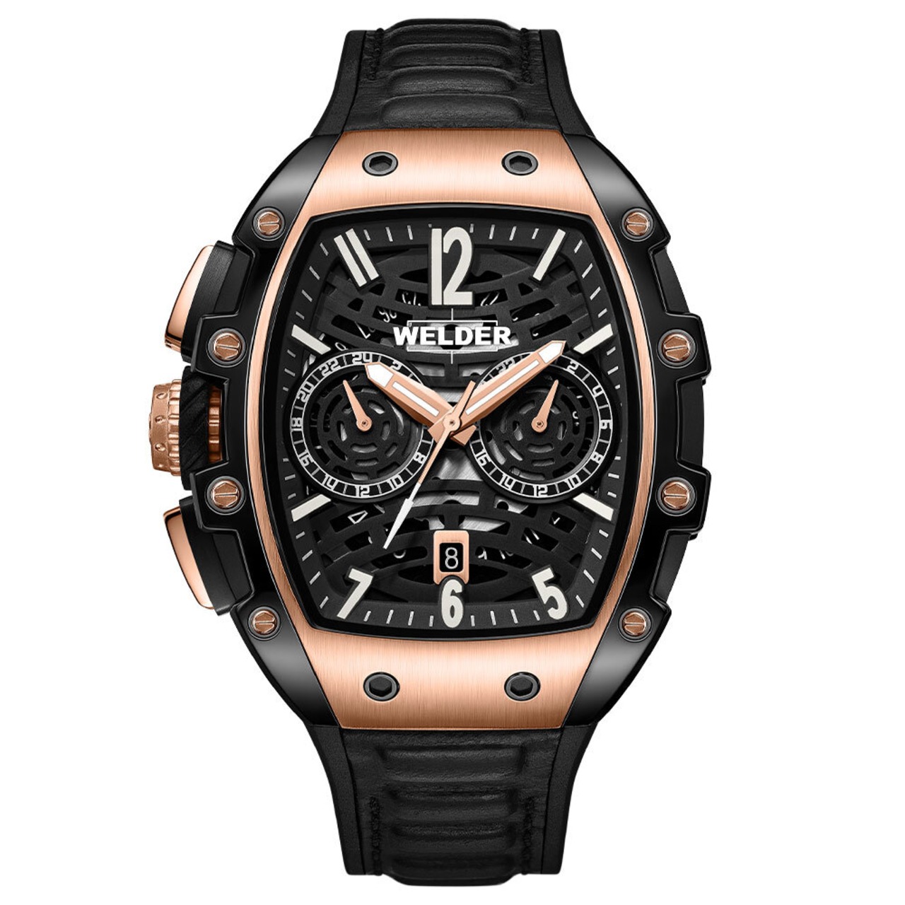 WELDERのW75シリーズ・クォーツモデルです。イタリアデザインのスイスメイド、ムーブは安心の日本製という「いいとこどり」が感度の高いバイヤーの目に留まり、多くのセレクトショップが取り扱うのも納得なお洒落時計。迫力あるトノー型のビッグボディが目を惹きますね。メタルxラバーの異素材仕様もラグジュアリー感があって◎。クォーツでありながらスケルトンになっているのもポイントでしょう。とにかく他の人と被らない、個性派の時計をお探しの方におすすめします。なかなかに格好いい時計ですよ!