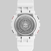 G-SHOCK全体にエヴァンゲリオン初号機が描かれ、12時側のバンドには初号機の頭部装備である角、ベゼル部分には初号機の顔、ベゼル下部から6時側のバンドにかけてはロンギヌスの槍を投擲しようとする左腕がデザインされています。