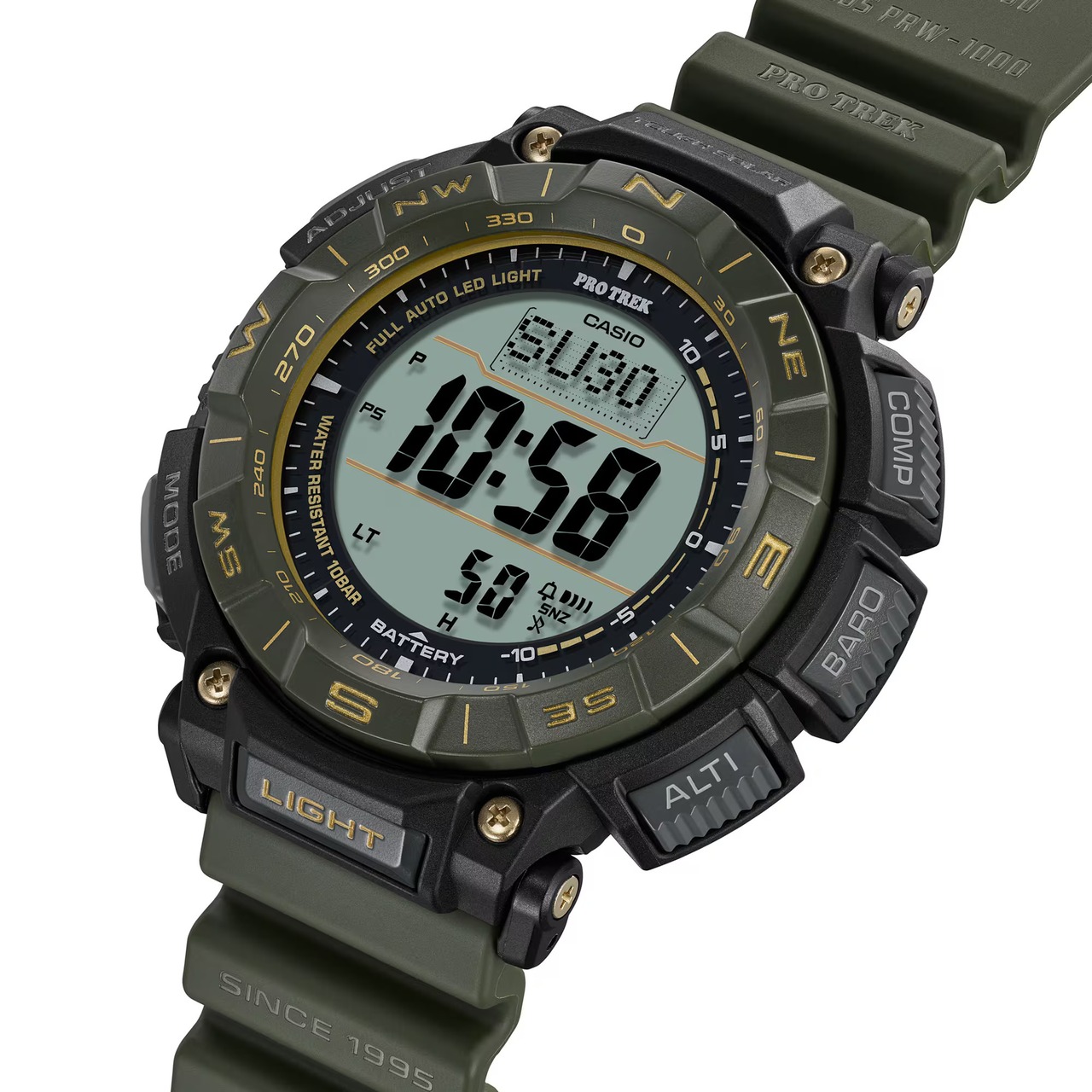 薄型液晶によりスリムなケースデザインを実現し、ケースやバンドには環境負荷低減に貢献するバイオマスプラスチックを採用。自然を愛するアウトドア愛好家の活動をサポートしながら、地球環境にも配慮した時計です。