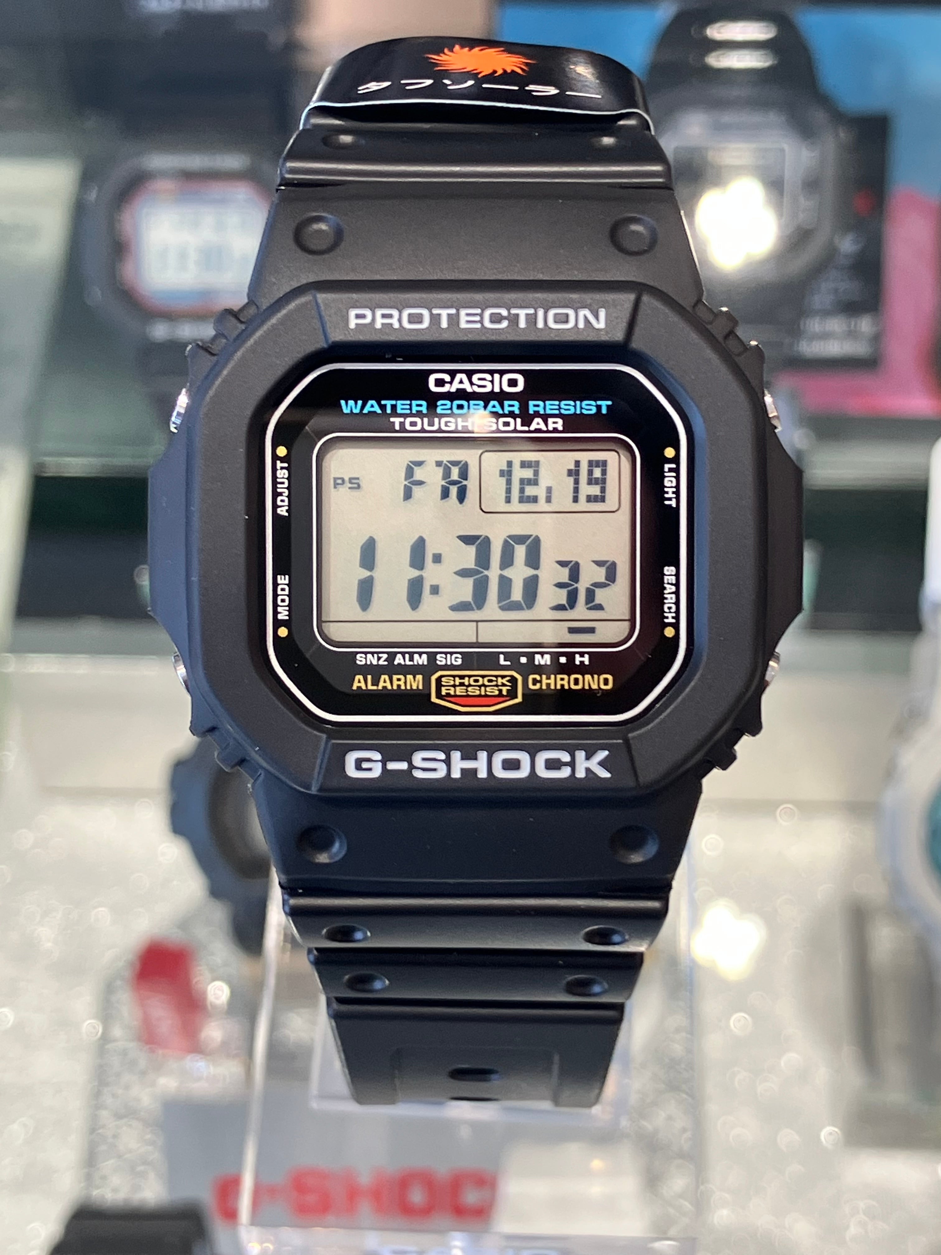 もはや説明不要の超定番ロングセラーG-SHOCKです。今ではこの系統全般の総称として名高い「スピードモデル」という呼び名。その元祖の直系モデルの、タフソーラーバージョンです。1990年代から今も色褪せることなく現役バリバリの名機は、まさにレトロフューチャーとも言うべき安定した格好良さがありますね。実用的で気兼ねなく使える時計なので、ファンならずとも一個持っていて損はないG-SHOCKですよ!