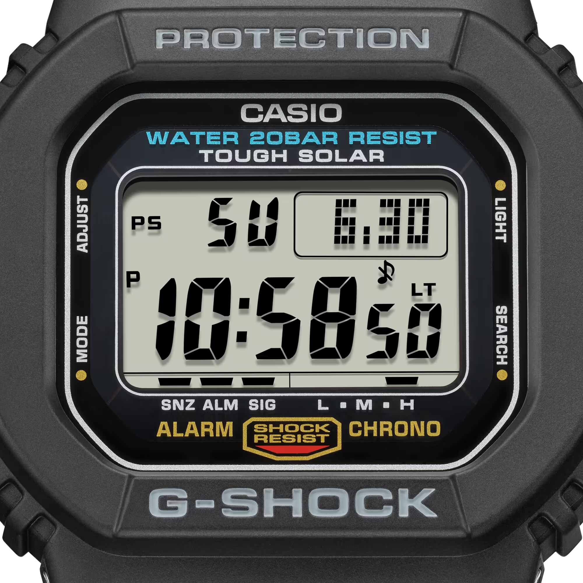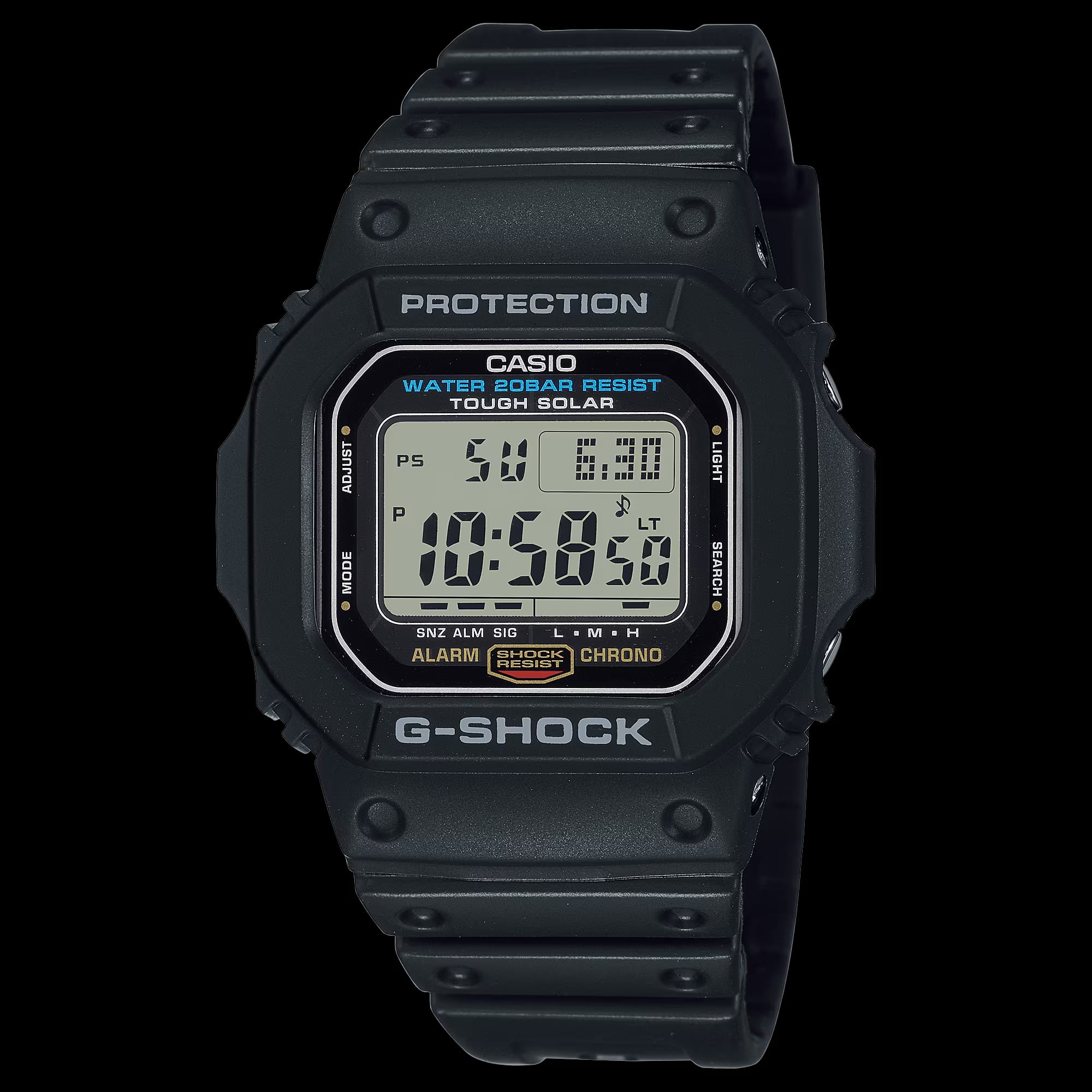 初代G-SHOCKのデザインを受け継いだ5600のタフソーラーモデル。赤いラインが特徴的な、従来のタフソーラーモデルG-5600に対し、スクエアデザインの中でもシンプルな配色のDW-5600C(1987年発売)のカラーリングを採用しました。G-SHOCKを代表するクラシックデザインモデルです。
