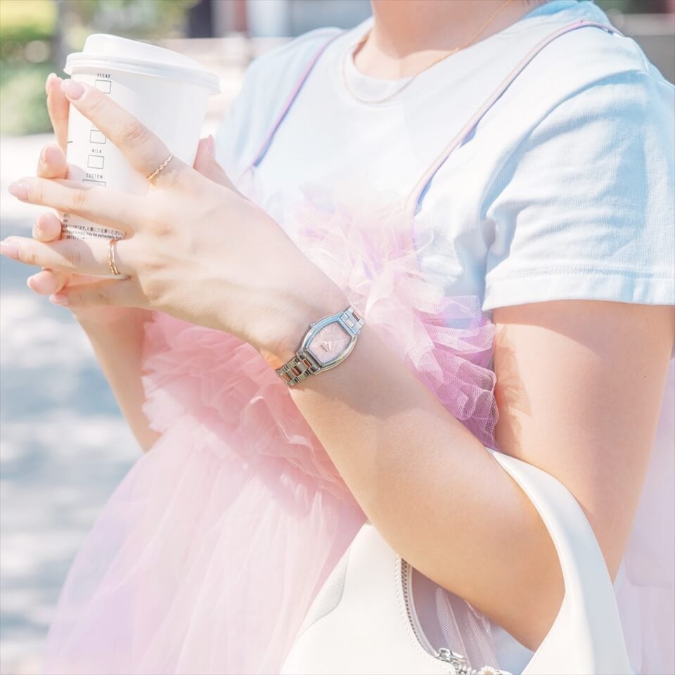日付もなくシンプルな文字盤で見やすく、ちょうどいいサイズ感。人気のトノー型なので、プレゼントにも最適ですよ♪