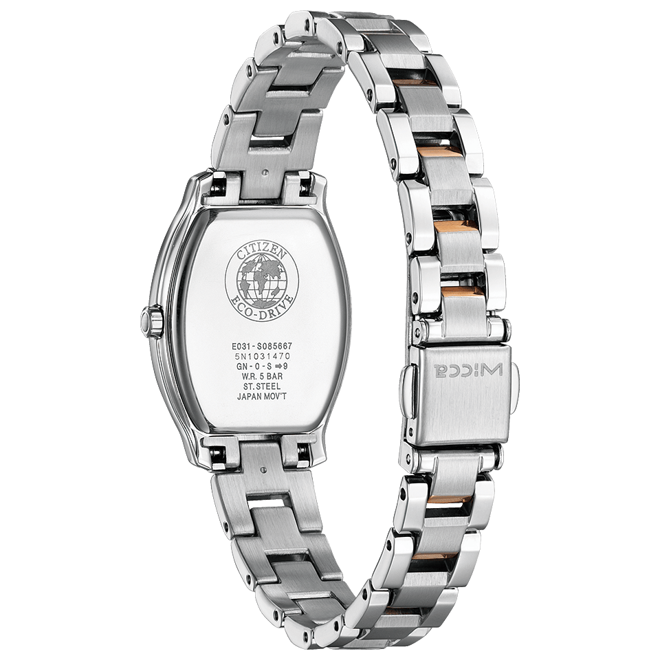 太陽光やお部屋の明かりなどが文字板を通り抜け、内部のソーラーセルに当たることで電気エネルギーを発生させ、時計を動かしています。