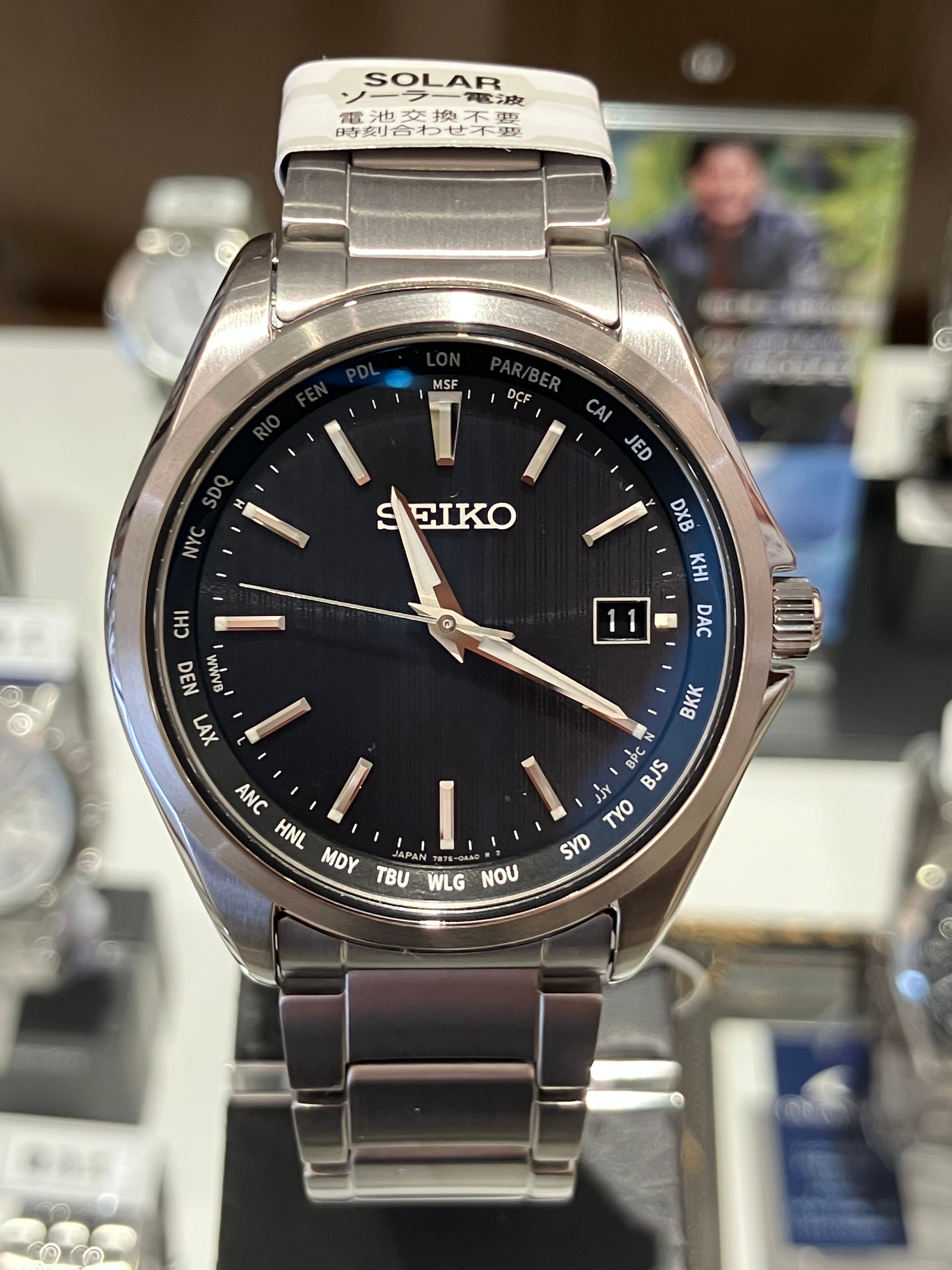 シンプルイズベスト。あっさりした文字盤にワールドタイム表記が程よいアクセントに。コスパも良く実用性に優れた、チタン製のソーラー電波です。