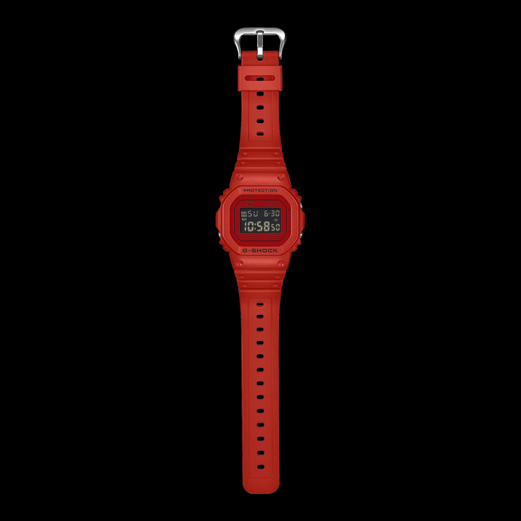 時計のフェイスに施された赤の色合いがバンドやベゼルと調和し、力強く質感のコントラストが印象的なデザインに仕上がっています。液晶は反転液晶で、各所にブラックを取り入れることでデザイン性を高めています。ブラックのアクセントカラーが赤を引き立て、G-SHOCKのアイデンティティを表現しています。
