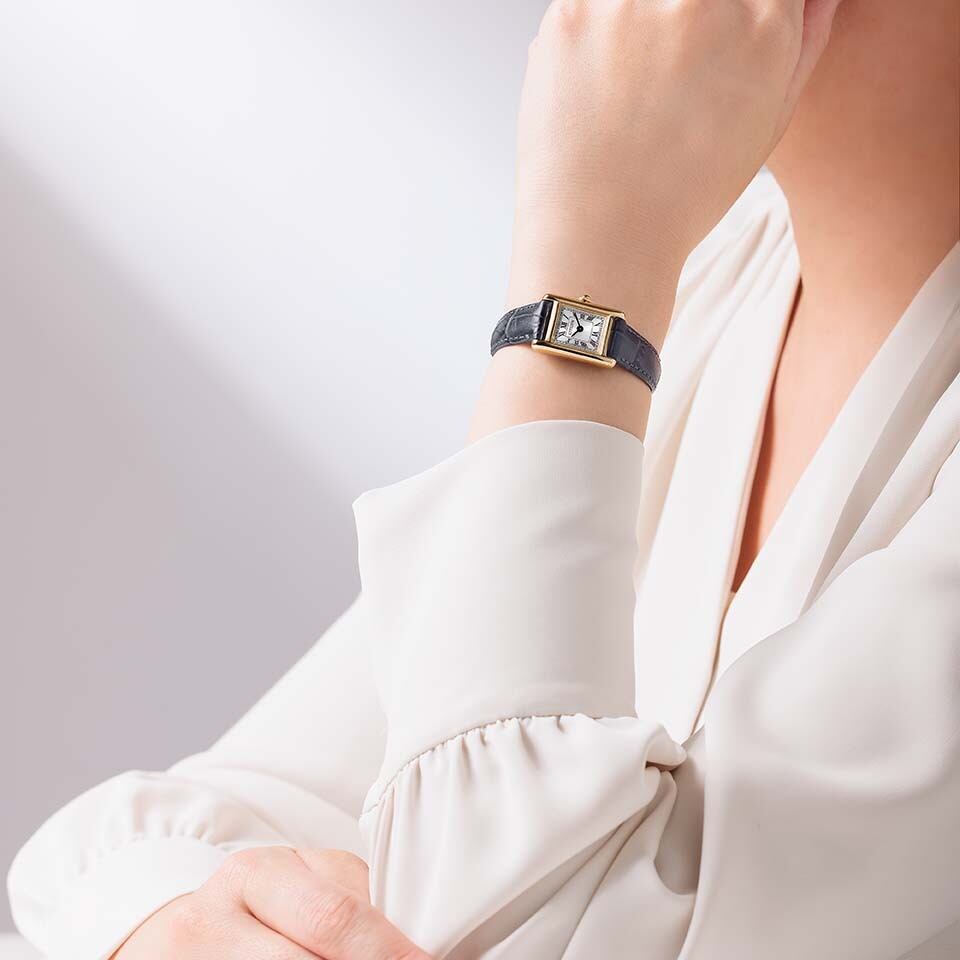ヴィンテージ調の雰囲気を漂わせながらも、優しさと落ち着きを感じるデザイン。サイドに丸みを持たせたケースが、洗練された優しさを醸し出します。ローマ数字で統一したインデックスと型押しを施した牛革バンドが、落ち着きのあるクラシカルな表情を際立たせています。少し大きめのりゅうずが小ぶりなケースにアクセントを添えます。