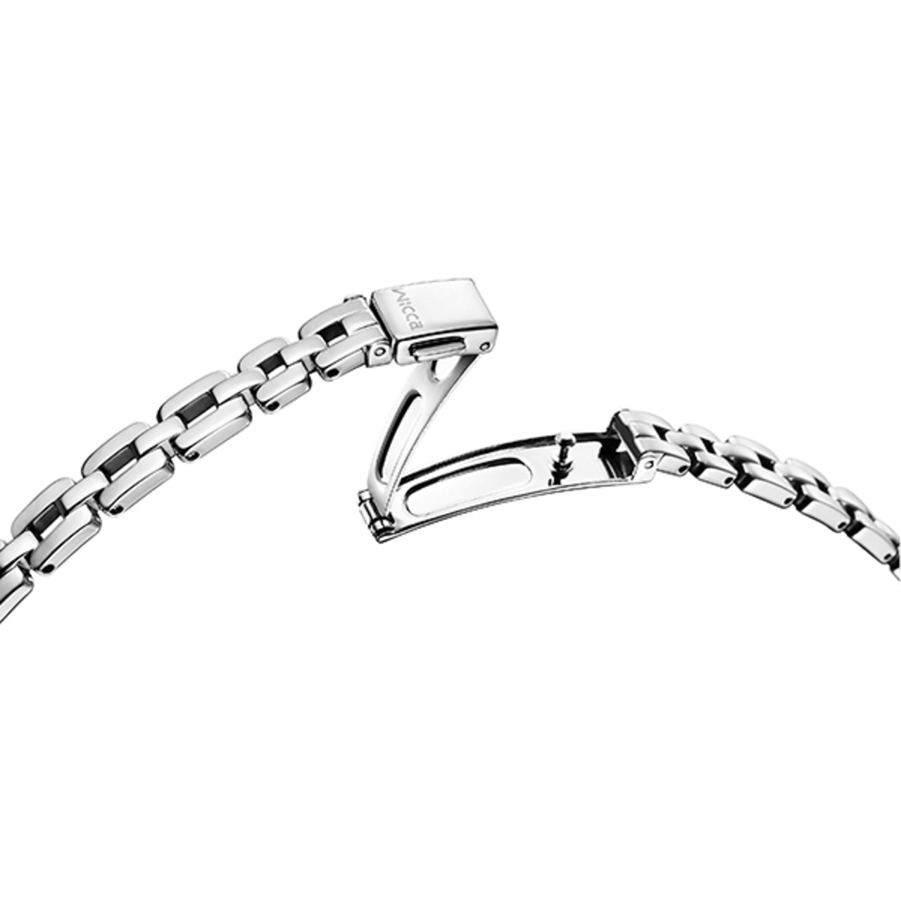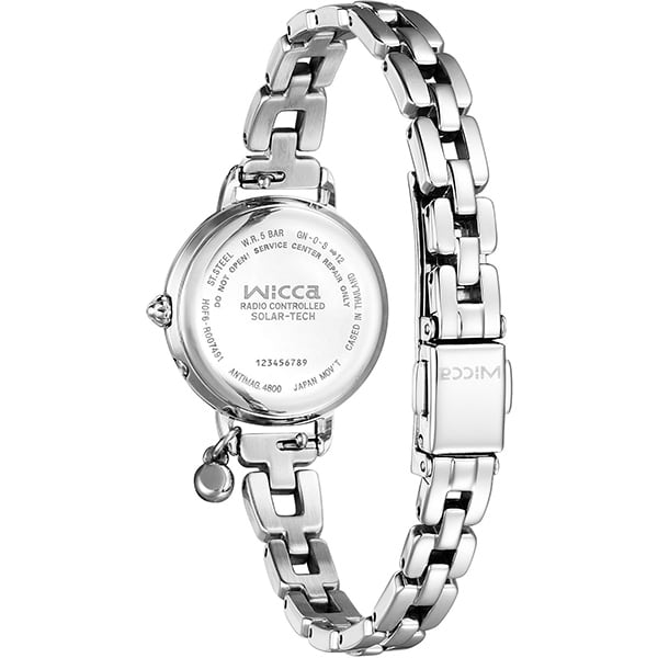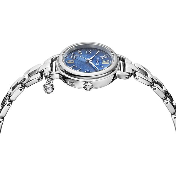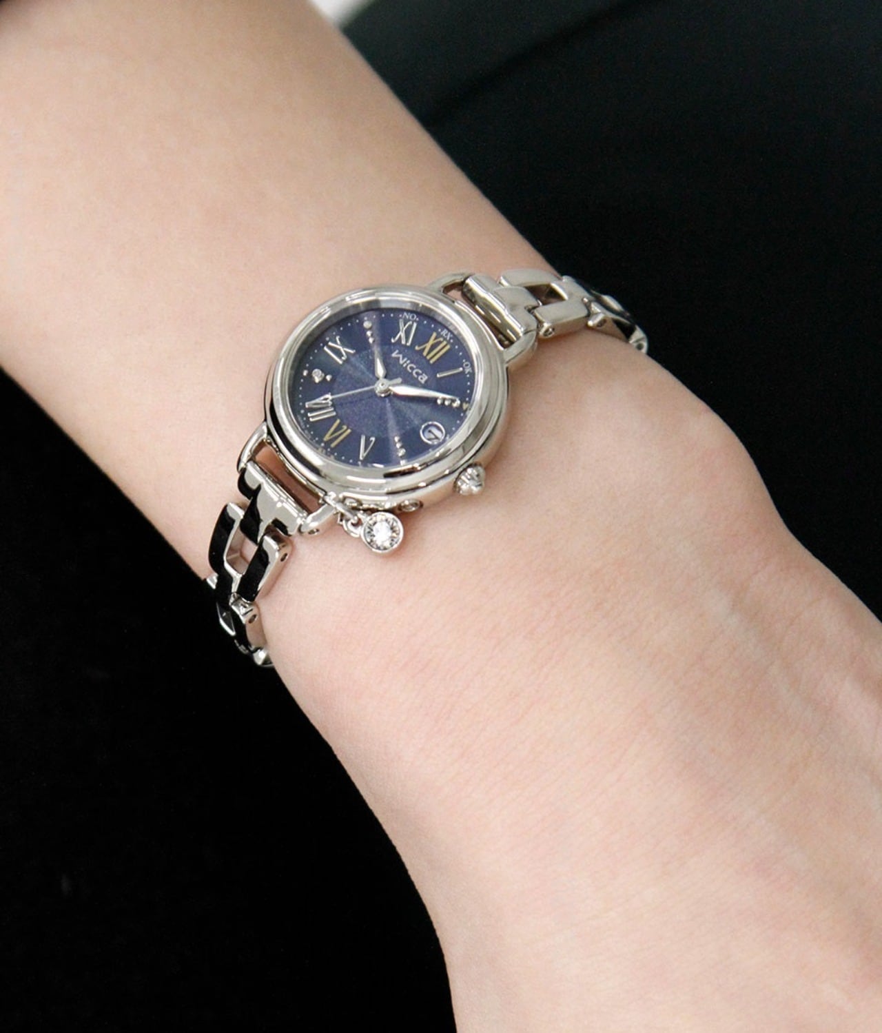 人気の定番「KL0-561-15」モデルに、文字板色ネイビータイプを追加し、カラーバリエーションが広がりました。このモデルには革バンドは付属せず、価格面でもバリエーションが広がりました。大人可愛い印象のローマ数字インデックスを採用。12時と6時の位置に、心をキュンとときめかせる差し色をプラスしました。インデックスの4ヵ所にジュエリーのように繊細な輝きを放つパーツをあしらい、四方にきらめく光を表現。8時の位置には本物の輝きを放つ「ときめくダイヤ」1粒をセッティングしています。揺れるたびに輝くクリスタルのチャームは取り外しが可能。シーンや気分によって2通りのスタイルを楽しめます。