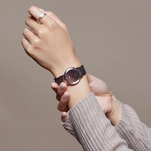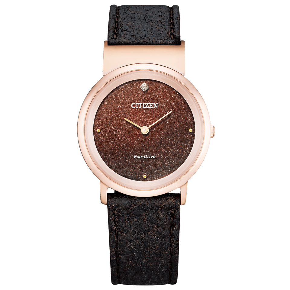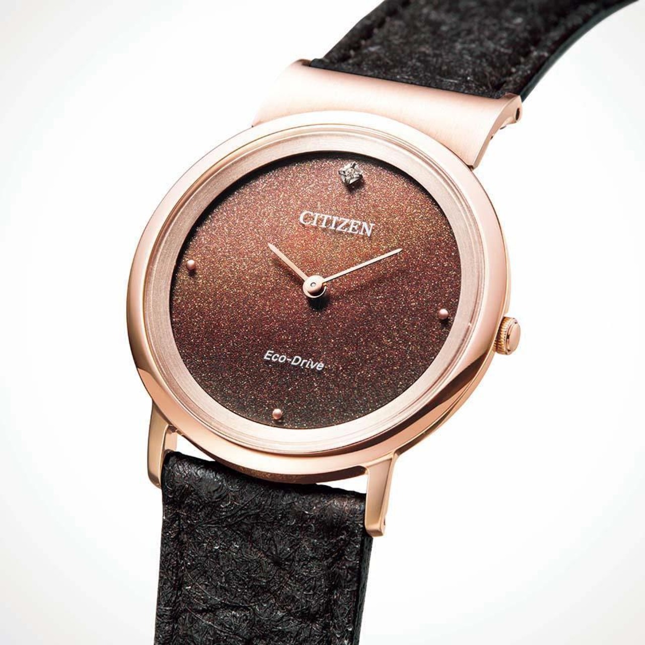 『Ambiluna Collection inspired by EARTH』・命を育む大地が持つ大胆さと繊細さをイメージ。文字板はブラウンのグラデーションに大胆なラメを施し、雨上がりの大地の瑞々しさを表現。12時位置にエシカルなラボグロウン・ダイヤモンドを配しました。・ストラップにはパイナップルの葉を原料とするサステナブルな素材「ピニャテックス」を使用。あえて繊維の質感を残し、ひとつとして同じものはない大地そのものを表現しています。