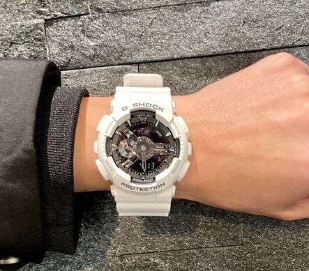 タフネスを追求し、進化を続けるG-SHOCKのカラーシリーズ「ホワイト&ブラックシリーズ」モデルです。ベースモデルには、無骨なタフネスデザインが人気のアナログビッグケースモデルをラインアップ。迫力ある造形に鮮やかなホワイトを採用。スニーカーやカジュアルな小物、工業製品などにも取り入れられ、デザイントレンドにもなっているモノトーンや高いコントラストを、光沢のあるホワイトとブラックで表現しました。更に、メタリックシルバーのインデックスや時分針をアクセントとし、クールなデザインに仕上げました。