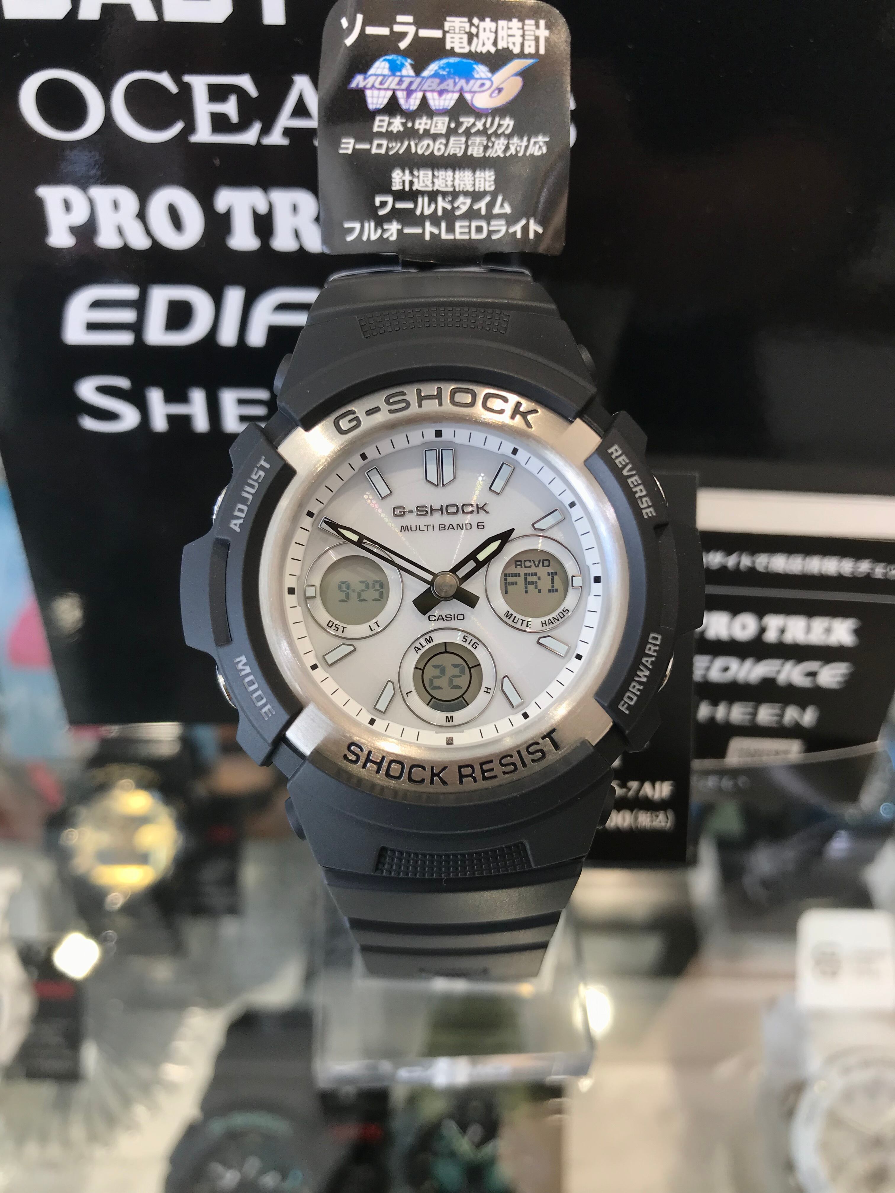 発売からずっと人気の衰えないAWG-M100シリーズのホワイト文字盤。デザインに無駄のない非常に見やすい実用派で、やはりこちらも超ロングセラーモデル。シリーズをとおして言えることですが、いろいろ見比べて最終的に選ぶお客様が多いのも納得の逸品です。何気にGショックで白文字盤はレアで、かなり新鮮な魅力がありますよ!