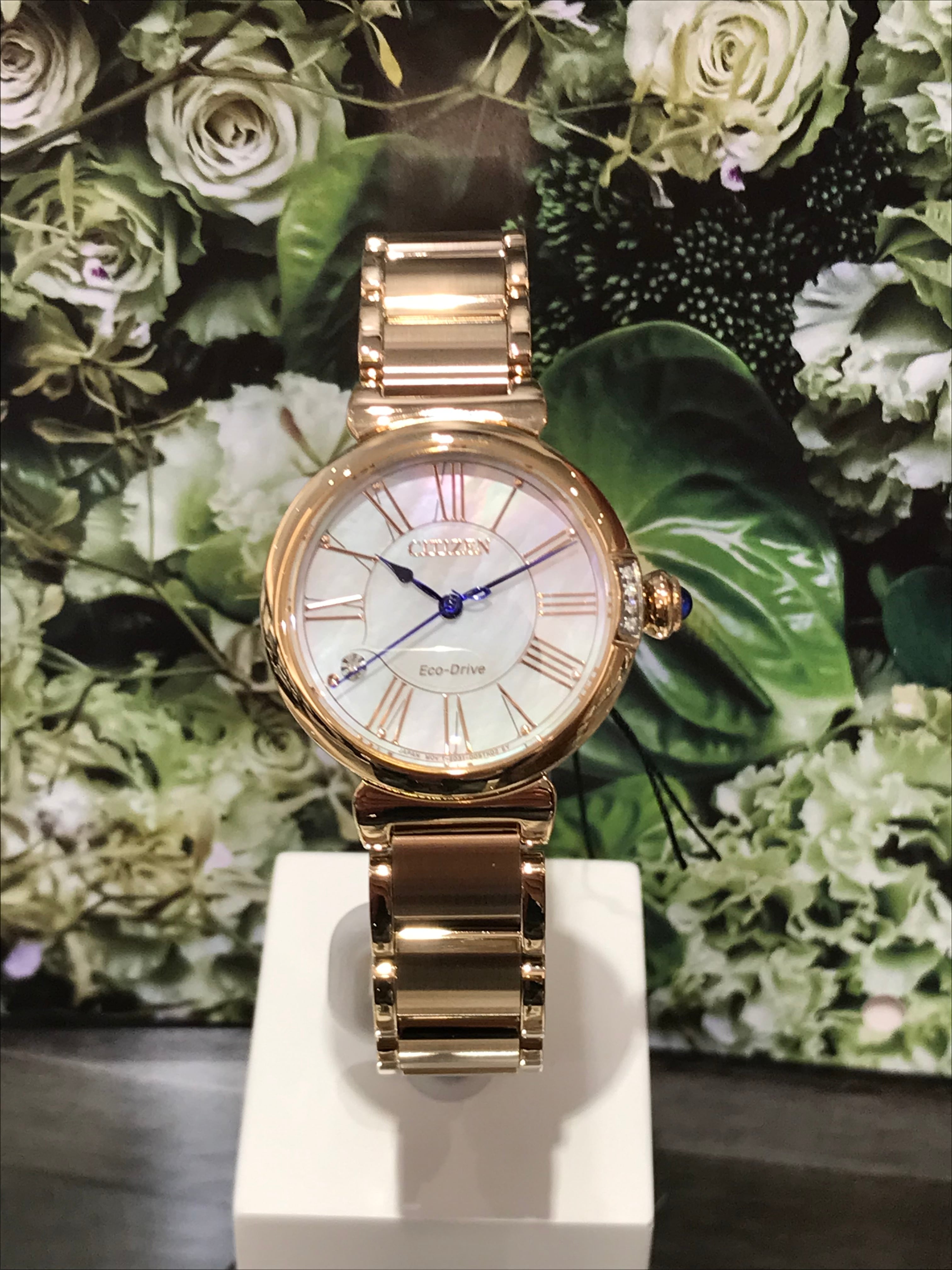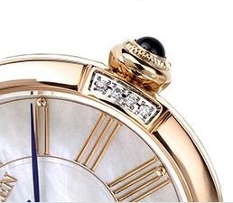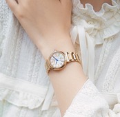 幸せの象徴として人々から愛されてきたスズランがモチーフで、流れるようにしなやかな文字板のデザインとクラシカルなローマ数字インデックスが優しく上品な印象を与えます。