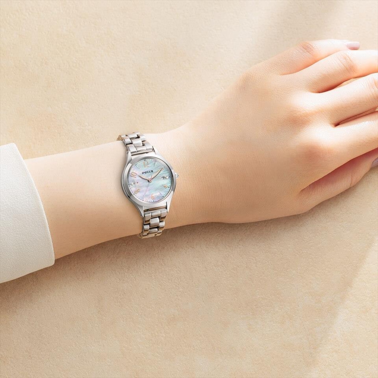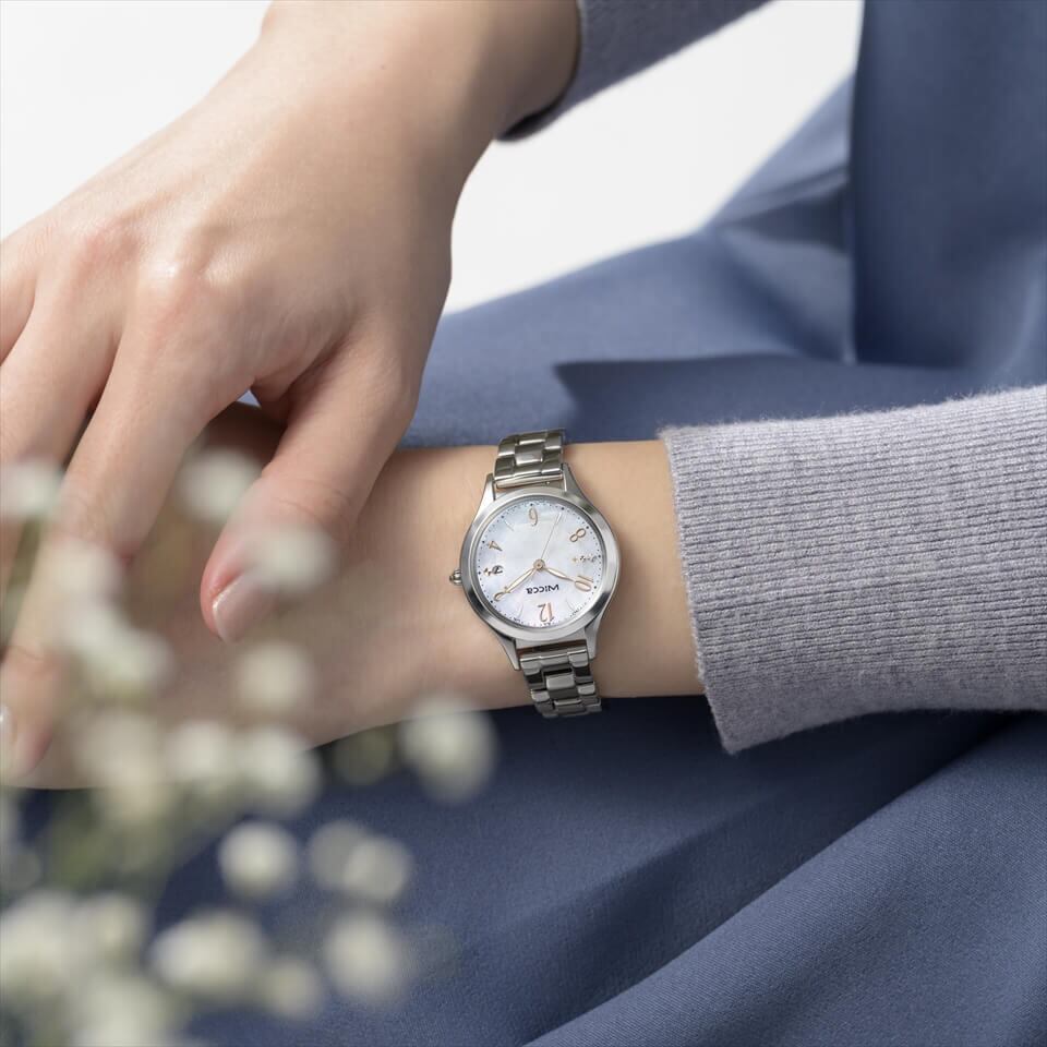 wiccaのイメージキャラクター、福原遥さんとのコラボレーションモデル第3弾。窓辺を彩るインテリア「サンキャッチャー」をテーマにした透明感あふれるデザイン。白蝶貝の文字板にカットクリスタルのようなパターンを描き、オーロラカラーのクリスタルとインデックスで、光の反射で多彩な色を魅せるサンキャッチャーのきらめきを表現しました。気分によって付け替えられる替えバンドは、福原遥さんが選んだライトピンクです。また、裏ぶたには頑張る毎日にそっと寄り添う時計になってほしいという思いを込めて、福原遥さんが選んだ「Take it one day at a time (1日1日を着実に)」のメッセージ入り。オーロラカラーの箔押しをあしらった限定BOX付きです。