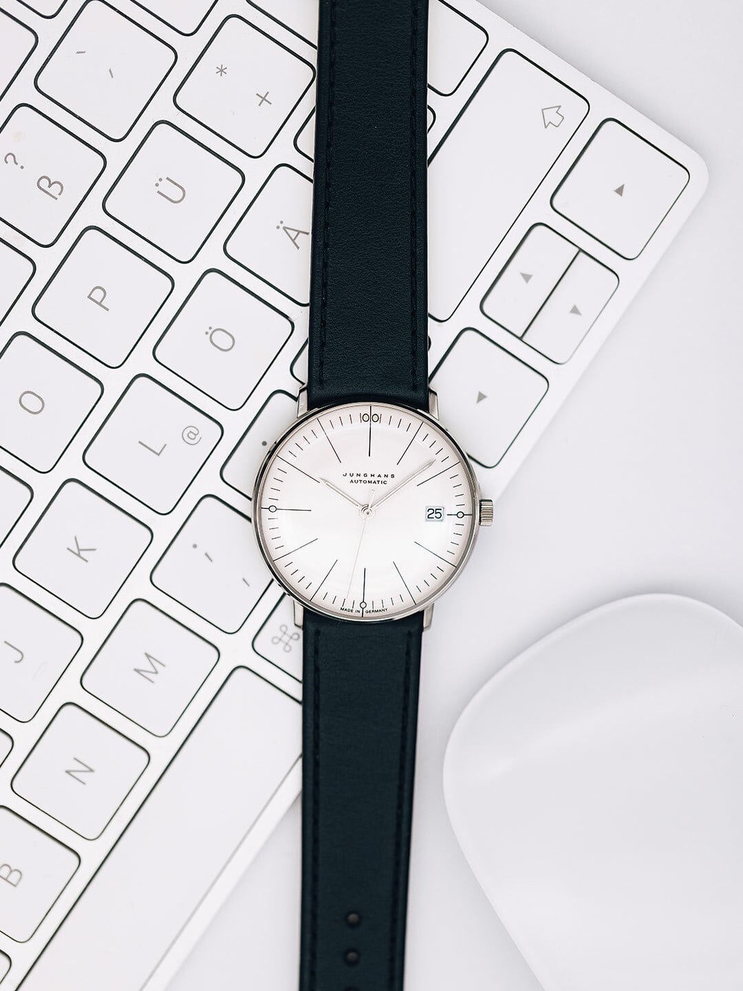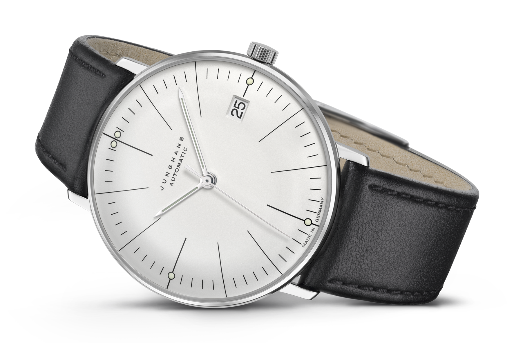 オリジナルのサイズとデザイン – 最新の装備:ユンハンスの新しいmax bill Kleine Automaticは、60年にわたる素晴らしい時計デザインを反映しています。34ミリというケースの直径によって1961年のオリジナルのサイズを正確に再現しています。そしてサファイアクリスタル、ミニマリズムのダイアル上の日付表示、自動巻ムーブメントのおかげで快適な装備になっています。美しさと実用的な価値が見事に融合したモデルです。