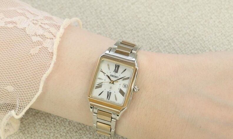 やはり黄金比の角型ケースは美しいですね。シャンパンゴールドとのコンビは、決して派手でなく品の良さが際立つ絶妙なカラーバランス。デキる大人の女性を演出してくれる、かなりハンサムな格好いい時計です。