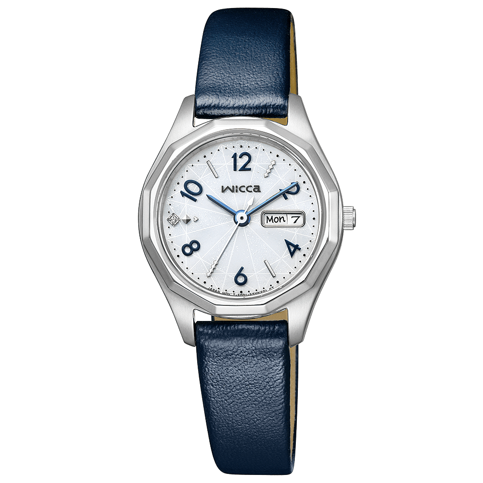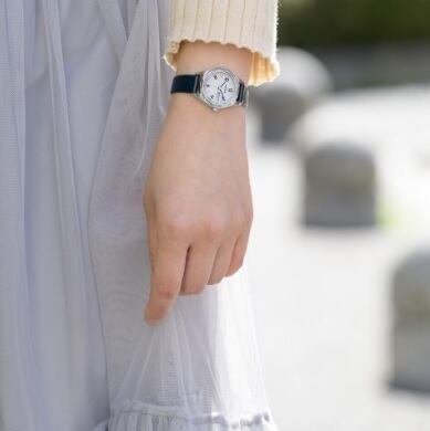 トレンドとクラシカルな雰囲気を両立した、デイ&デイト付きのソーラーテック搭載モデル。少し大きめのケースにアラビア数字のインデックスを組み合わせて、かわいらしさと見やすさを両立。きちんとしたい日にも、カジュアルなおしゃれを楽しみたい日にも活躍する1本です。いろいろな角度から輝く表情を楽ませてくれる文字板のラメパターンには、「毎日どんな瞬間も輝けますように」という想いを込めています。