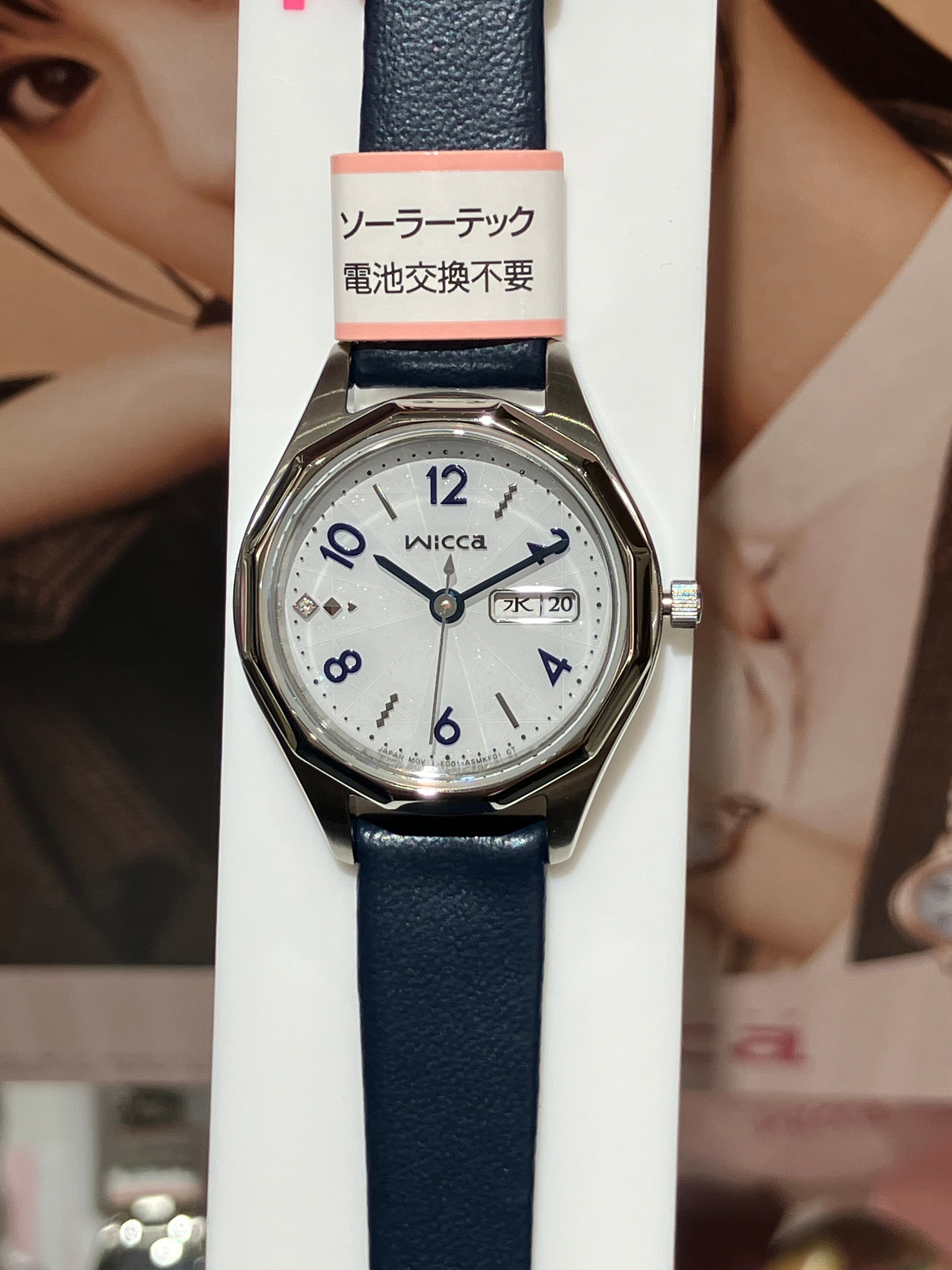 とても見やすい上に日付曜日表示と、実用性バッチリながらも「ちょいラメ」のキラキラ文字盤がネイビーの革バンドとマッチして、なかなかにお洒落な時計ですよ♪