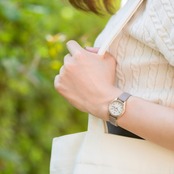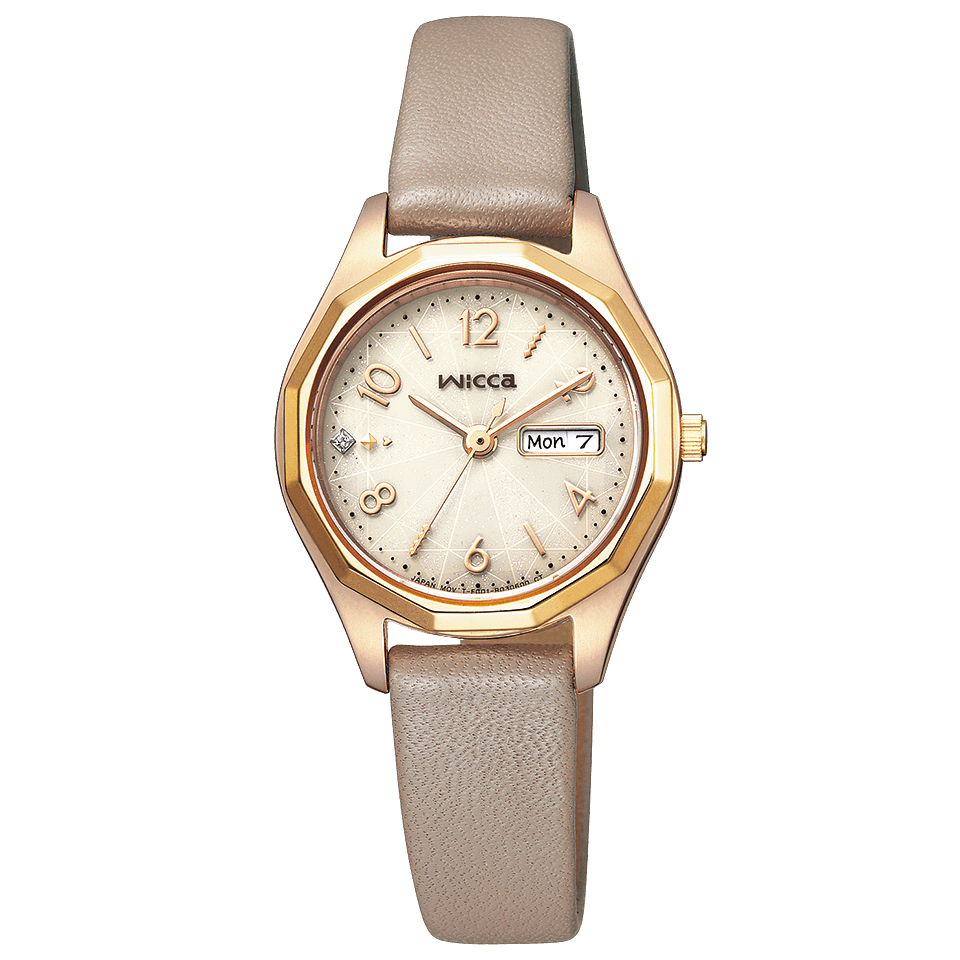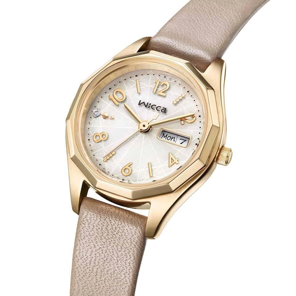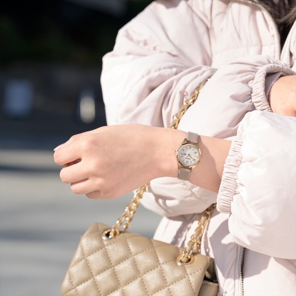 トレンドとクラシカルな雰囲気を両立した、デイ&デイト付きのソーラーテック搭載モデル。少し大きめのケースにアラビア数字のインデックスを組み合わせて、かわいらしさと見やすさを両立。きちんとしたい日にも、カジュアルなおしゃれを楽しみたい日にも活躍する1本です。いろいろな角度から輝く表情を楽ませてくれる文字板のラメパターンには、「毎日どんな瞬間も輝けますように」という想いを込めています。