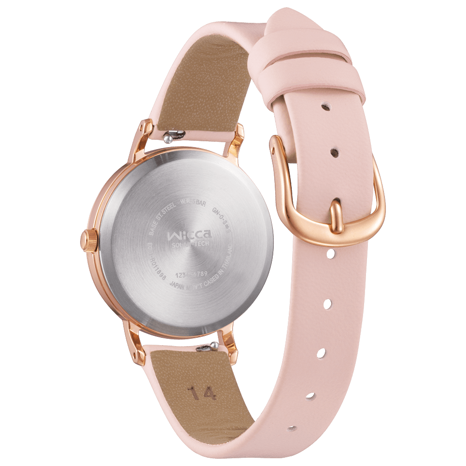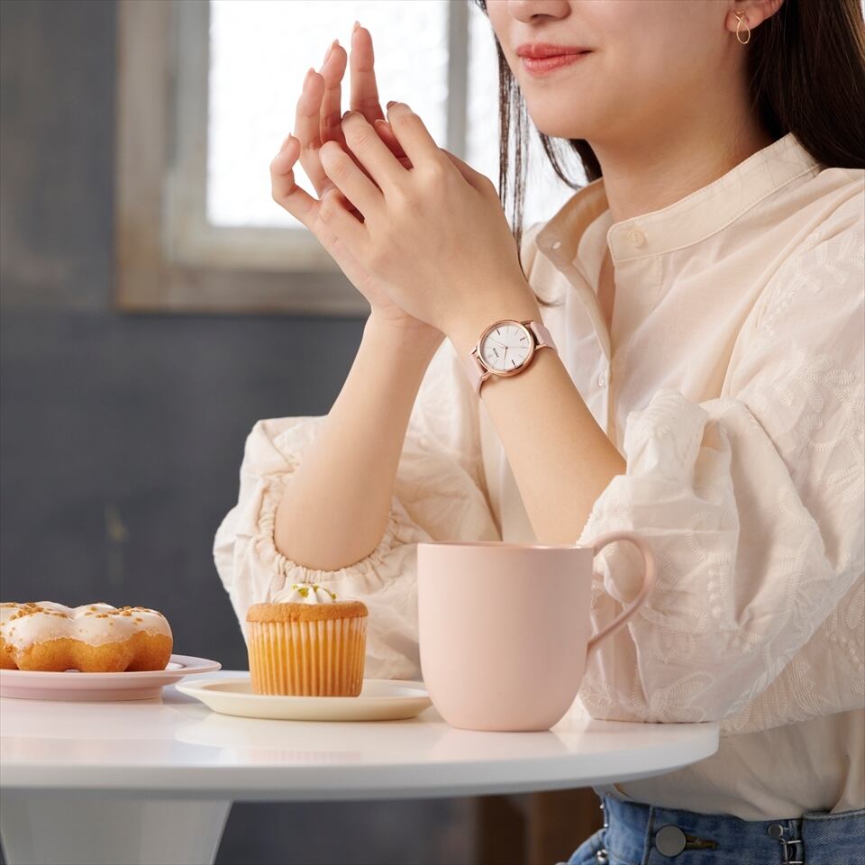 肌なじみが良いピンクのバンドは、環境に配慮した合成皮革「エコペット(ECOPET®)」を使用しています。
